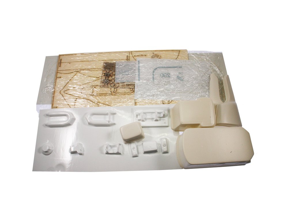 Po otevření víka krabice naleznete dřevěné díly modelu z překližky, sadu lišt, drobné součásti uzavřené v sáčcích, sadu výkresů a manuál.
