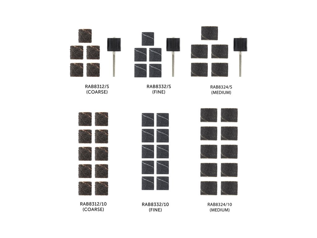 Rotacraft brusné válečky o zrnitosti P240 (10ks v balení) pro dokončovací práce na kovových, plastových, dřevěných a kamenných obrobcích. Určeno pro stopkový unášečSH-RAB8324/S. maximální otáčky 20 000 ot/min.