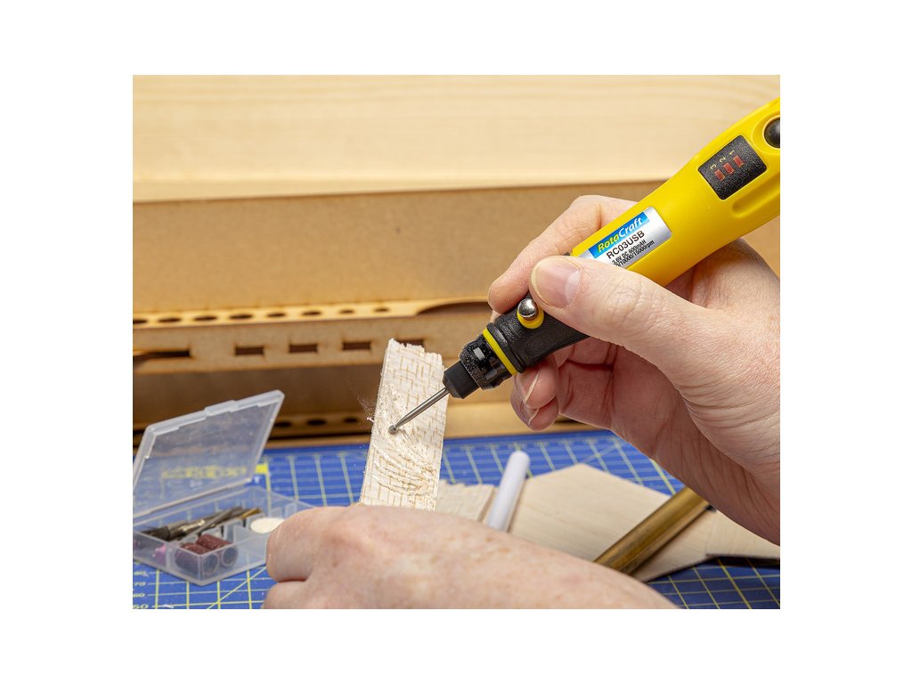 Rotacraft vrtací frézka RC03 se 12 nástroji a integrovanou baterií LiIon 3,6 V. Lehká frézka do ruky má troje otáčky: 5000/10000/15000ot/min, kleštinu 2,3 mm a k dispozici 12 ks různých rotačních nástrojů. Ideální pro přesné, složité práce rytí, broušení, leštění apod. Protože má nízkou hmotnost, práce s ní neunaví. K nabití baterie je přiložen USB kabel.