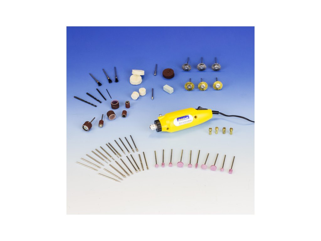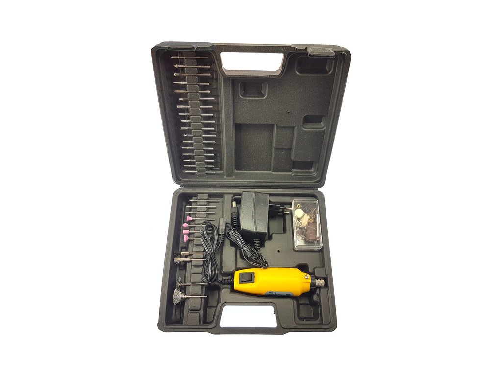 Rotacraft vrtací frézka RC12 se 75 nástroji je umístěna v hliníkovém kufru 220mm x 200mm x 60mm. Lehká frézka do ruky je napájena pomocí síťového zdroje 12V, má otáčky 18000 ot/min, kleštiny 1, 2.35, 3, 3.2mm. Ideální pro přesné, složité práce rytí, broušení, leštění apod.