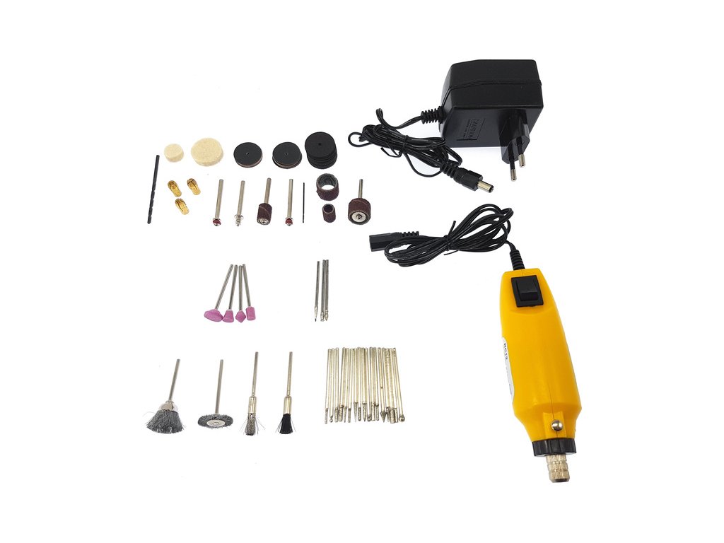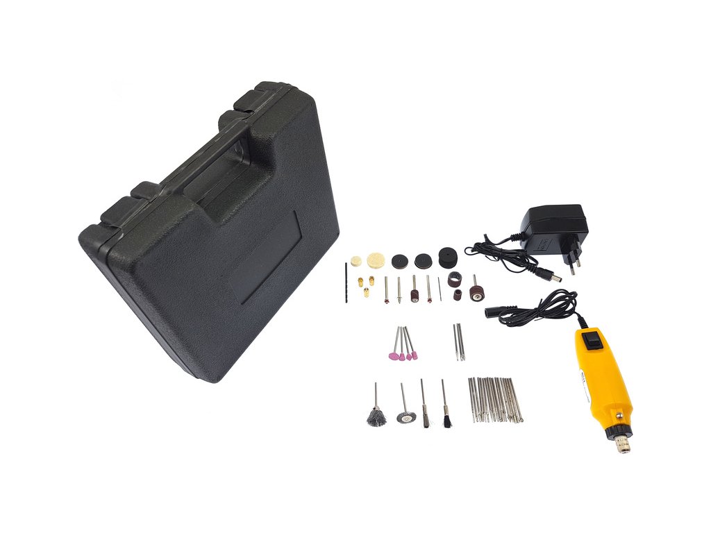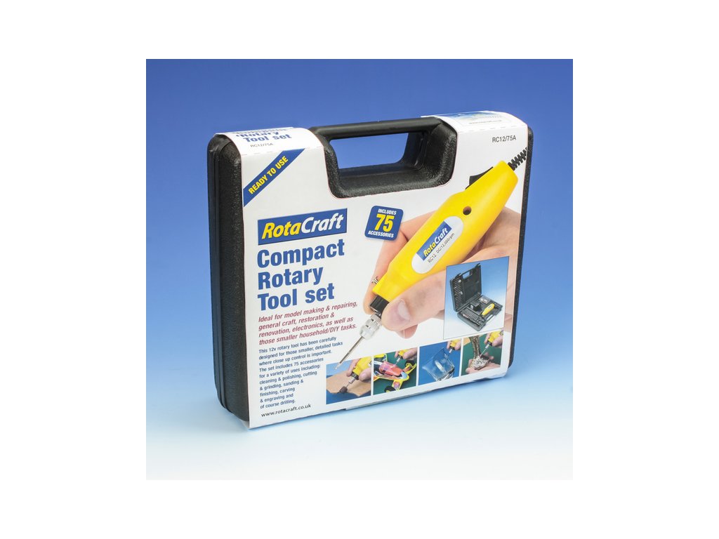 Rotacraft vrtací frézka RC12 se 75 nástroji je umístěna v kufru 220mm x 200mm x 60mm. Lehká frézka do ruky je napájena pomocí síťového zdroje 12V, je jednorychlostí a má otáčky 18000 ot/min, kleštiny 1, 2.35, 3, 3.2mm. Ideální pro přesné, složité práce rytí, broušení, leštění apod.