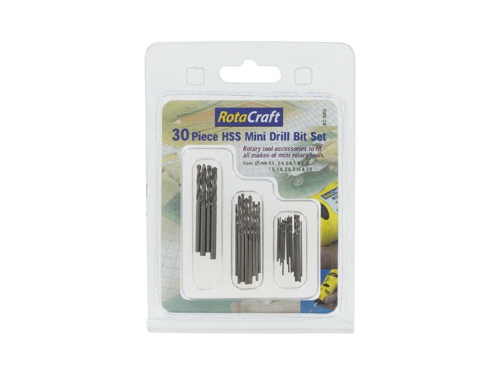 Rotacraft vrtáky HSS o průměru 0,5mm - 3mm (sada 30ks) v přehledné kazetě s označením průměru vrtáků. Rozměry: 0.5mm, 0.6mm, 0.8mm, 1mm, 1.2mm, 1.5mm, 1.8mm, 2mm, 2.35mm, 3mm.