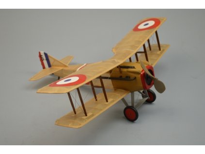 Minimaketa francouzského stíhacího letadla s gumovým pohonem. Laserem vyřezávané díly, vrtule, gumový svazek a potah. materiál. Rozpětí 457 mm.