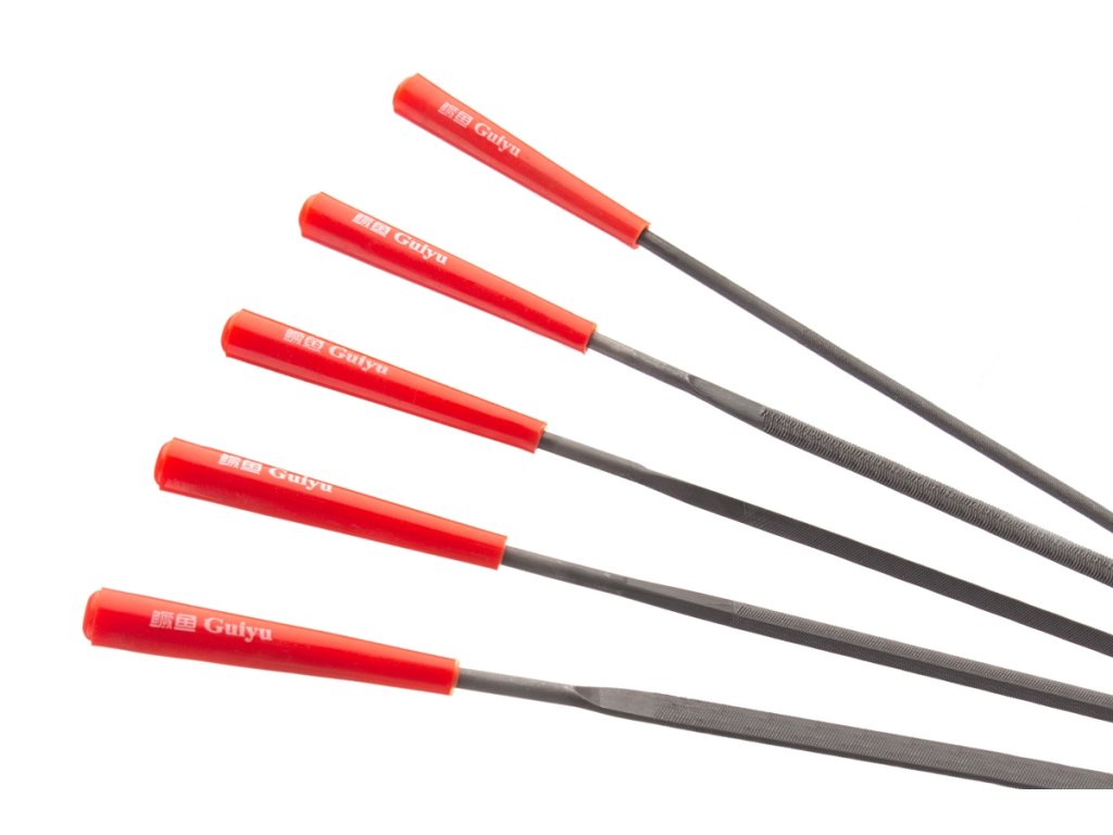 Sada obsahuje Kulatý, Oválný, Trojúhelníkový, Čtvercový a Plochý pilník.