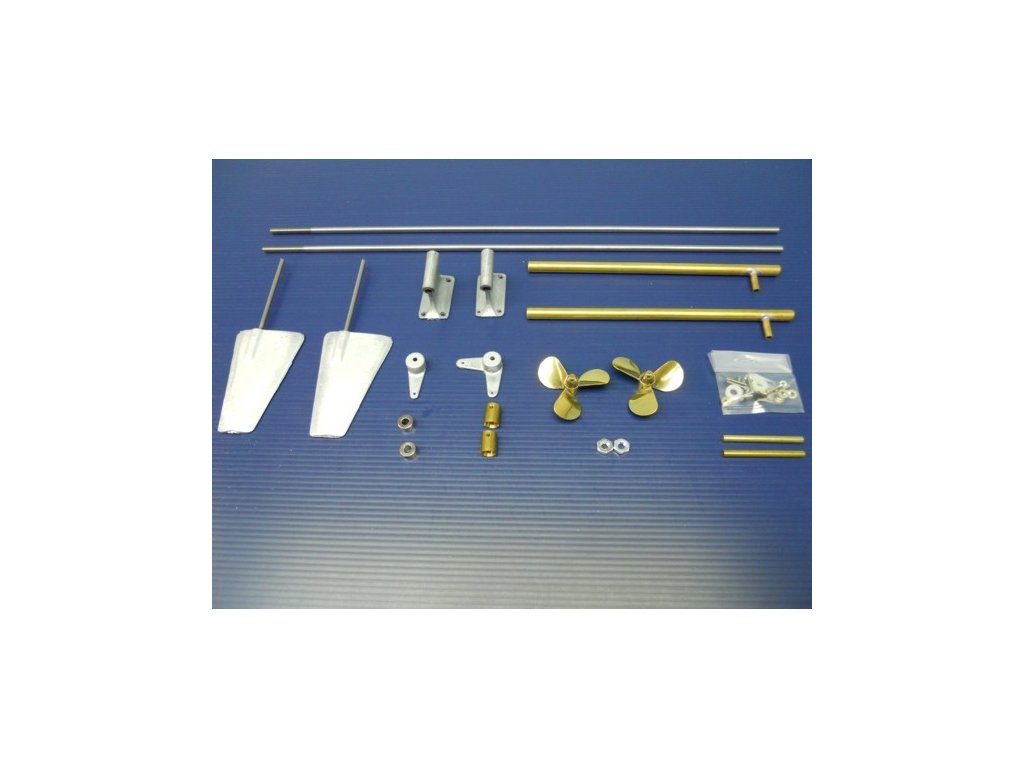 Sada 2 hřídelí s pouzdry, kardan. spojkami, 2 držáky pouzder, 2 kovové3listé lodní šrouby, sada 2 kormidel s táhly a pákami, spojovací materiál pro model rychlého člunu Dauntless nebo USS Crockett.Doplňkové parametry