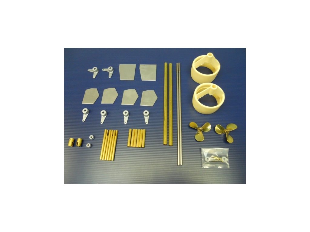Pohonná sada pro remorkér Dumas American Beauty. Obsahuje: 2x hřídel s pouzdrem, 2x Kortova tryska, sada kormidel a pák, 2x kovový 3listý lodní šroub, spojovací materiál.