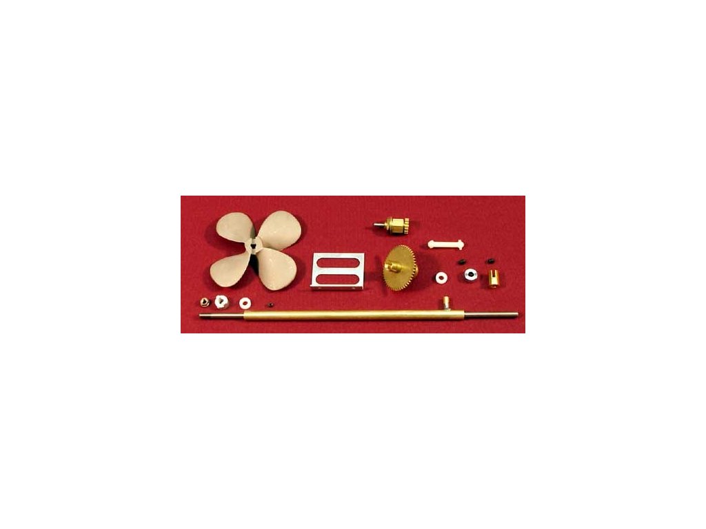 Pohonná sada pro remorkér Dumas Brooklyn. Obsahuje: hřídel s pouzdrem, převodovku 3:1, kardan. spojku, 4listý lodní šroub, spojovací materiál.