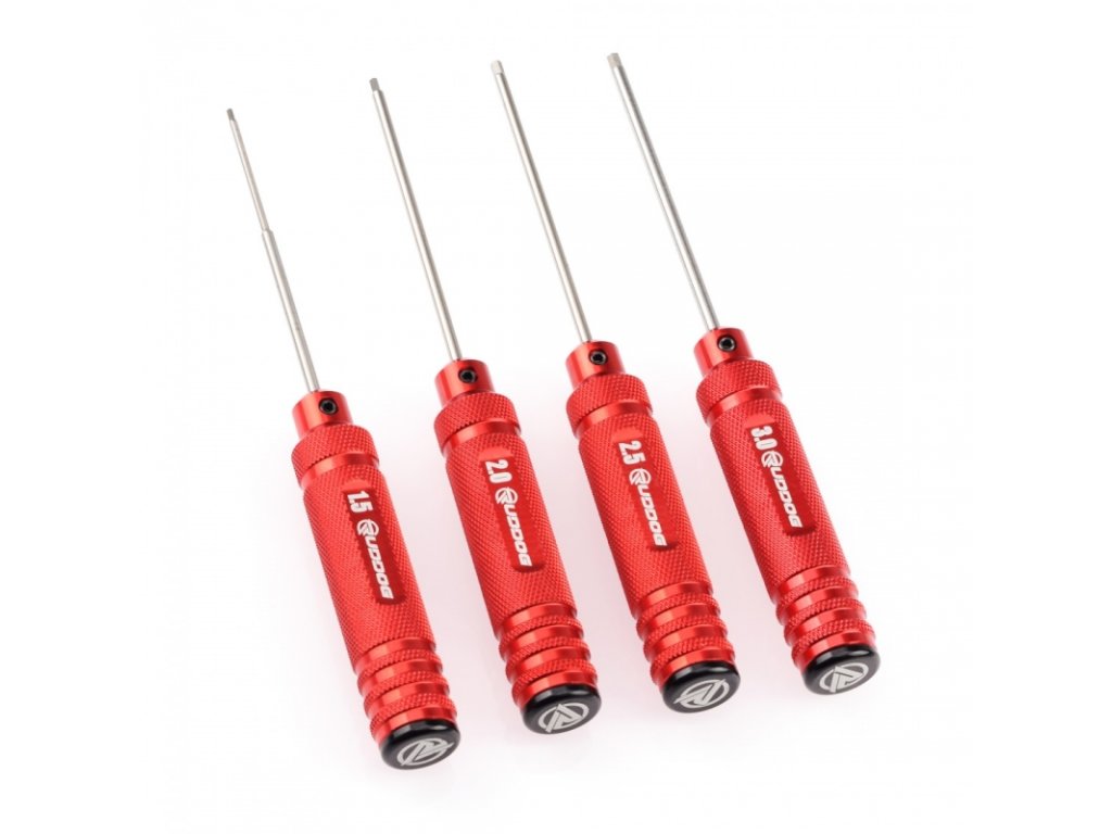 Stále se rozšiřující sortiment výrobků společnosti RUDDOG Products nyní zahrnuje praktickou sadu šestihranných/Imbus klíčů pro stavbu a údržbu modelů aut v měřítku 1:10 a 1:8 vybavených šestihrannými/Imbus šrouby. Ergonomické, červeně eloxované hliníkové rukojeti jsou pro snadnou identifikaci označeny příslušnou velikostí. Sada obsahuje čtyři běžné velikosti šestihranných/imbus klíčů a je cenově dostupná a kvalitní.