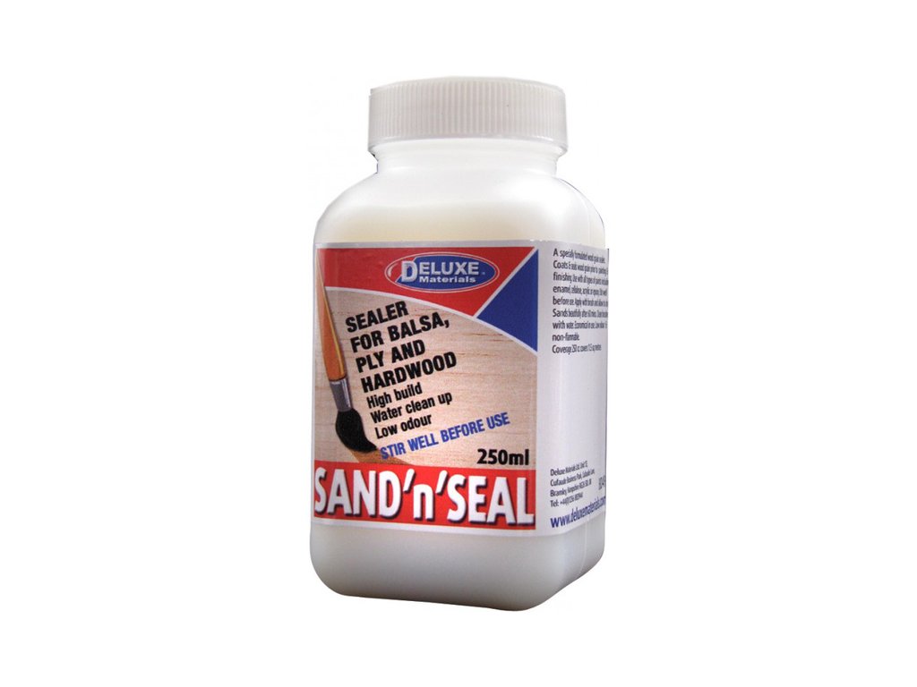 Přípravek Sand And Seal slouží jako podkladní vrstva pod barvu. Vyplní póry a celkově zpevní povrch dřeva, překližek a balsy. Nanáší se štětcem, po jedné hodině lze povrch přebrousit a následně nabarvit. Přípravkem lze natřít plochu asi 1.5 m².