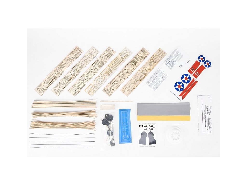Stavebnice obsahuje: balsové laserem vyřezávané díly, balsové nosníky, vakuově lisované díly (kryt motoru, kryt kabiny...), plastovou vrtuli s hřídelí a hlavicí, gumový svazek (soutěžní guma FAI TAN II), kola, ocelovou strunu na podvozek a další drobné díly, barevný potahový papír, aršík samolepek, stavební plán.