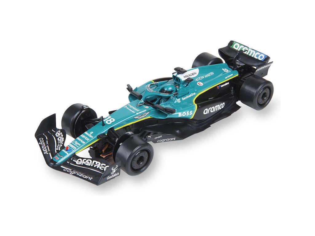 Dráhové autíčko SCX Advance Aston Martin Formula 1 Stroll 25 v měřítku 1:32, pro digitální autodráhy SCX Advance. Verze 2.0. Zatáčení předních kol.