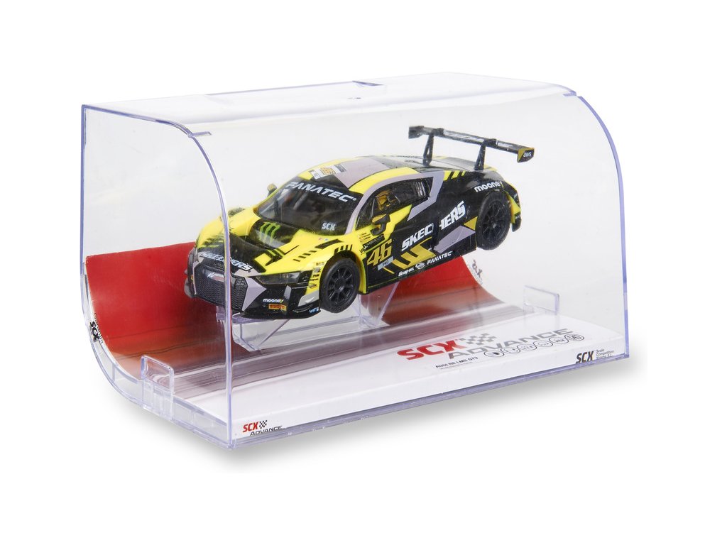 Dráhové autíčko SCX Advance Audi R8 LMS VR46 v měřítku 1:32, verze 2.0, pro digitální autodráhy SCX Advance. Autíčko je vybaveno LED osvětlením. Na podvozku se nachází přepínač digital / analog - autíčko lze tedy používat na digitální autodráze SCX Advance i na analogové autodráze SCX Original.
