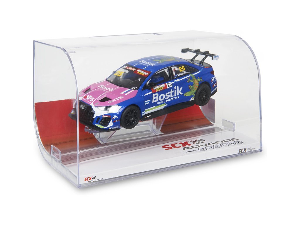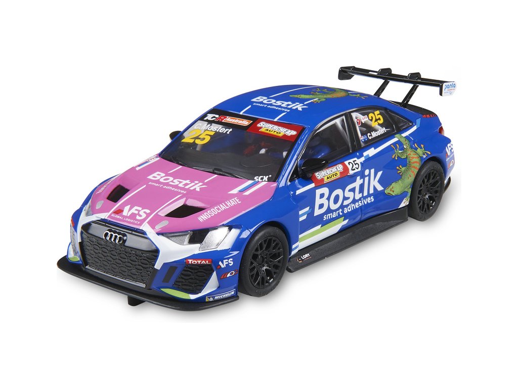 Dráhové autíčko SCX Advance Audi RS3 LMS TCR Bostik v měřítku 1:32, verze 2.0, pro digitální autodráhy SCX Advance. Autíčko je vybaveno LED osvětlením. Na podvozku se nachází přepínač digital / analog - autíčko lze tedy používat na digitální autodráze SCX Advance i na analogové autodráze SCX Original.