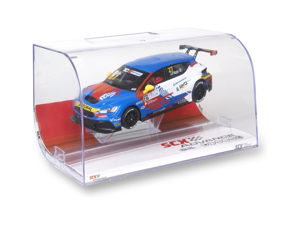 Dráhové autíčko SCX Advance Cupra Leon Competition J. Filippi v měřítku 1:32, verze 2.0, pro digitální autodráhy SCX Advance. Autíčko je vybaveno LED osvětlením. Na podvozku se nachází přepínač digital / analog - autíčko lze tedy používat na digitální autodráze SCX Advance i na analogové autodráze SCX Original.