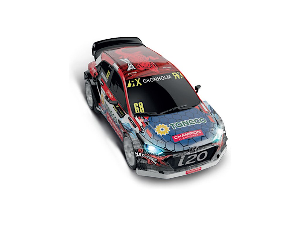 Dráhové autíčko SCX Advance Hyundai i-20 RX Gronholm v měřítku 1:32, verze 2.0, pro digitální autodráhy SCX Advance. Autíčko je vybaveno LED osvětlením. Na podvozku se nachází přepínač digital / analog - autíčko lze tedy používat na digitální autodráze SCX Advance i na analogové autodráze SCX Original.