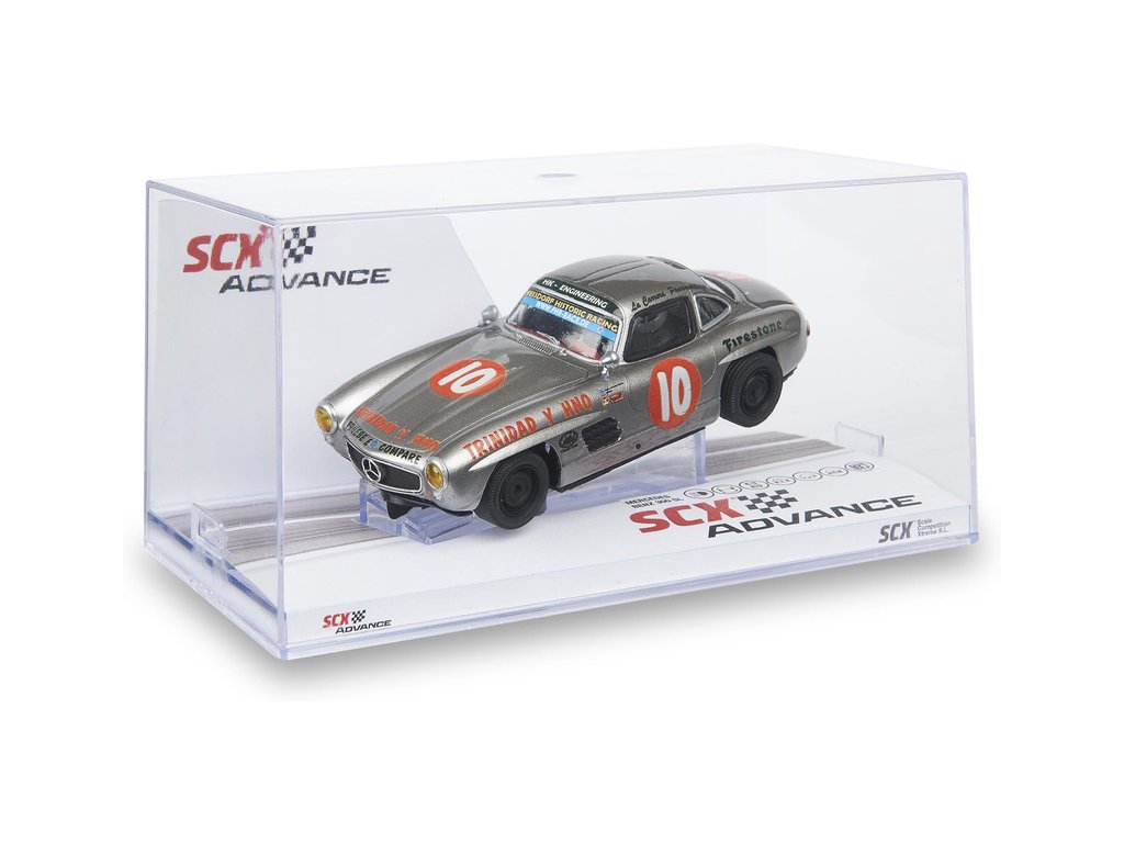 Dráhové autíčko SCX Advance Mercedes-Benz 300 SL Coupé Panamerican v měřítku 1:32, verze 2.0, pro digitální autodráhy SCX Advance. Autíčko je vybaveno LED osvětlením. Na podvozku se nachází přepínač digital / analog - autíčko lze tedy používat na digitální autodráze SCX Advance i na analogové autodráze SCX Original.