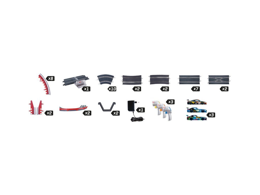 Balení obsahuje traťové díly, most, 2x křížení, svodidla, krajnice s mantinely, Bluetooth napájecí rovinku, 3x dráhové autíčko, 3x ovladač a napájecí zdroj. Návod CZ.