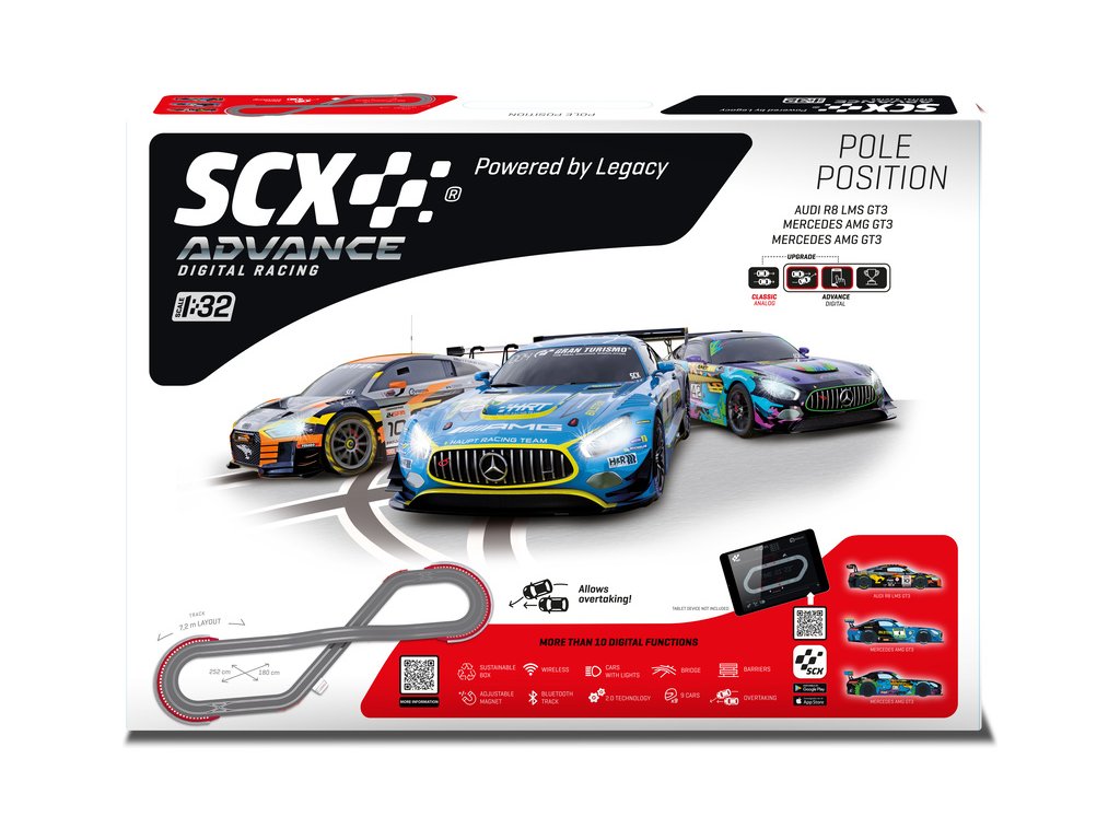 Elektrická závodní autodráha SCX Advance Pole Position 2.0 v klasickém měřítku 1:32 pro napínavější závody - vynikající digitální autodráha s možností předjížděním v křížení (ovladačem řízená výhybka), Bluetooth rovinkou pro počítání kol v aplikaci, mostem svodidly a krajnicí s mantinely. Balení obsahuje tři bezdrátové ovladače s přepínačem výhybky, tři detailně zpracovaná digitální dráhová autíčka SCX Mercedes AMG GT3 Bilstein, Audi R8 LMS GT3 Marc VDS a Mercedes AMG GT3Makes & Models, která jsou vybavena LED světly. Součástí je také exkluzivně Bluetooth rovinka pro napínavé závody. Plocha pro rozložení: 252 x180 cm. Složení tratě je velmi snadné, jednotlivé traťové díly zacvaknete do sebe, spárujete ovladače s autíčky a můžete začít závodit.