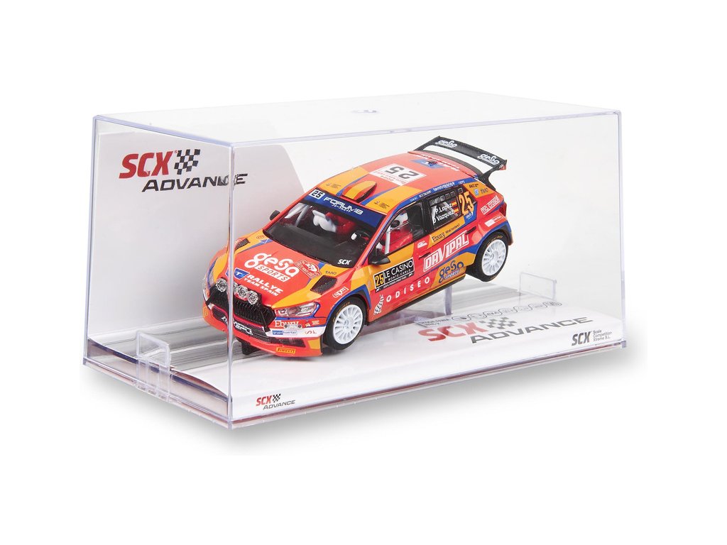 Dráhové autíčko SCX Advance Škoda Fabia WRC2 Pepe López v měřítku 1:32, verze 2.0, pro digitální autodráhy SCX Advance. Autíčko je vybaveno LED osvětlením. Na podvozku se nachází přepínač digital / analog - autíčko lze tedy používat na digitální autodráze SCX Advance i na analogové autodráze SCX Original. Autíčko má náhon 4x4.
