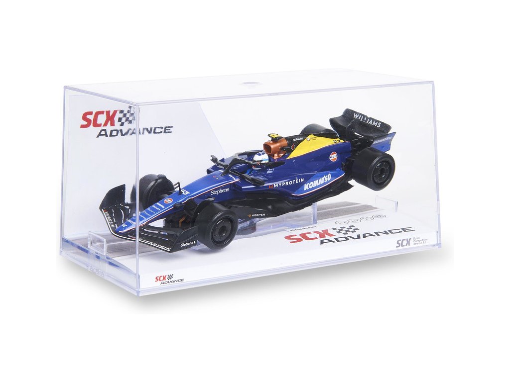 Dráhové autíčko SCX Advance Williams Formula 1 Colapinto 24 v měřítku 1:32, verze 2.0, pro digitální autodráhy SCX Advance. Autíčko je vybaveno zatáčením předních kol. Na podvozku se nachází přepínač digital / analog - autíčko lze tedy používat na digitální autodráze SCX Advance i na analogové autodráze SCX Original.