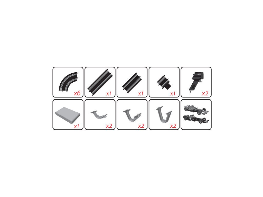 Balení obsahuje traťové díly, most, 2x dráhové autíčko, 2x ovladač a box pro baterie.
