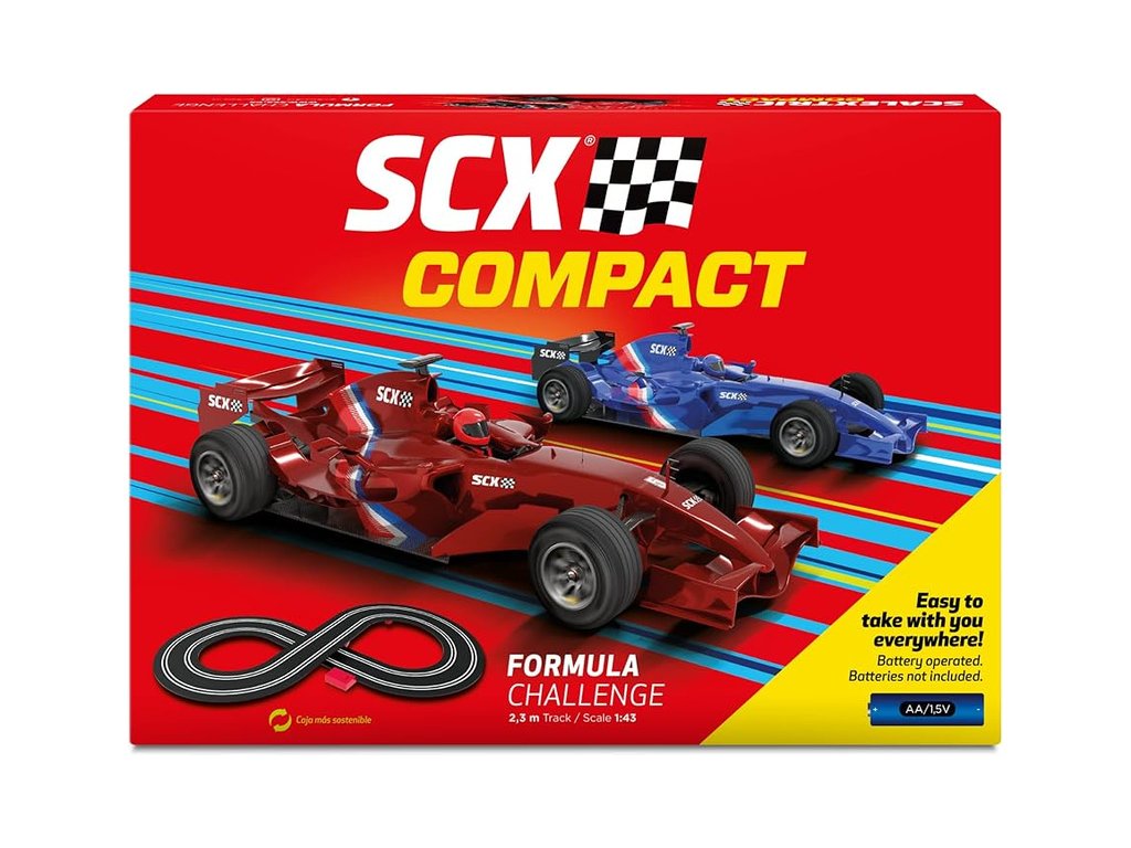 Autodráha SCX Compact Formula Challenge v měřítku 1:43 - analogová elektrická uživatelsky jednoduchá autodráha s klasickým tvarem osmičky s mostem. Napájení pomocí tužkových baterií. Podle obrázku v manuálu sestavíte díly autodráhy připojíte ovladače a doplníte 8x AA tužkové baterie - EM-B1320. Dráhová autíčka jsou detailně zpracovaná ve tvaru formule F. Plocha pro rozložení: 94 x 45,6 cm. Délka tratě: 2,3 m.