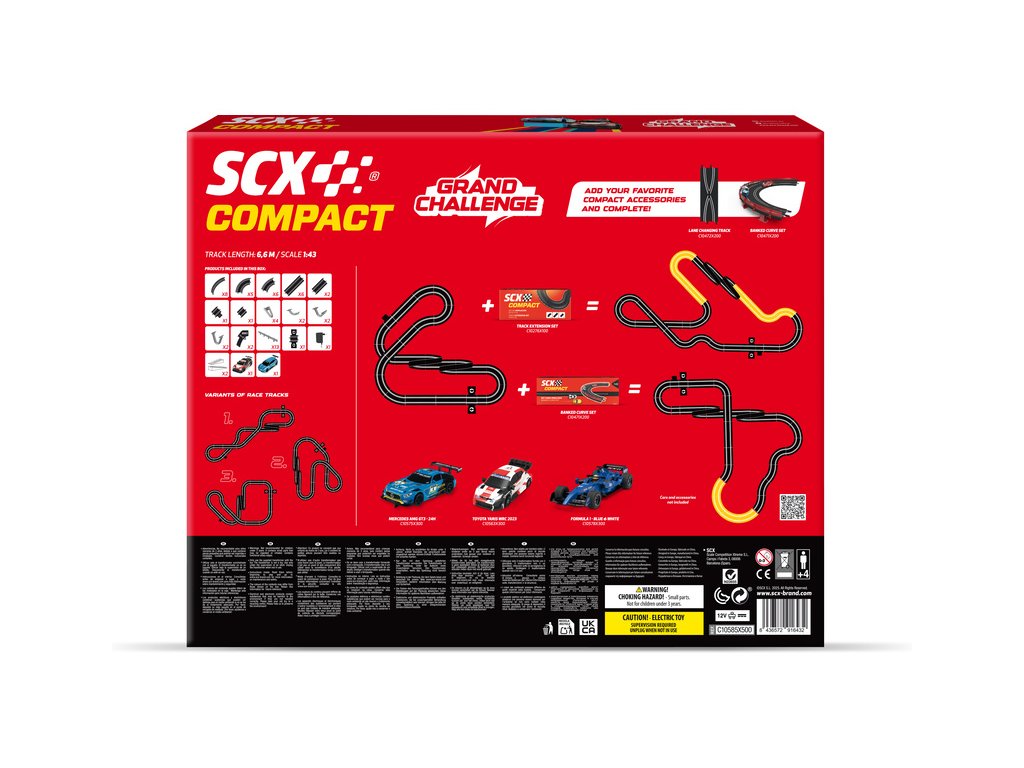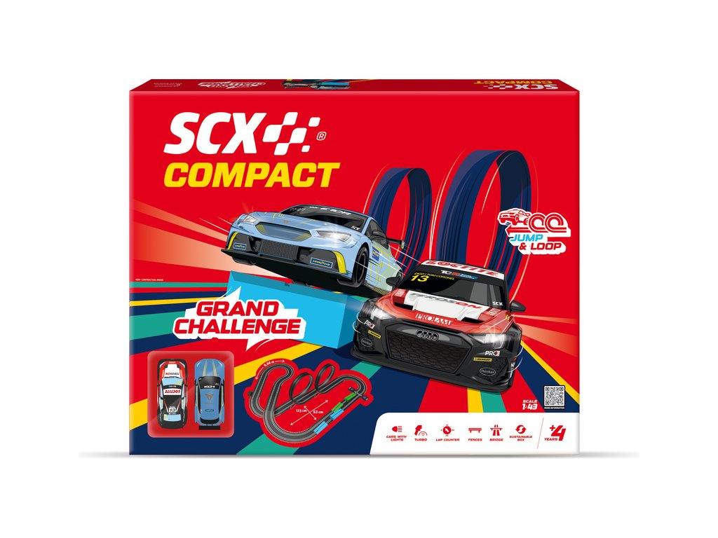 Autodráha SCX Compact Grand Challenge v měřítku 1:43 - analogová autodráha s mostem, svodidly, 2x loopingem a skokánky. Dva bezdrátové ovladače, dvě detailní dráhová autíčka se světly, Audi RS3 LMS a Cupra. Plocha pro rozložení základní varianty: 123 x 63 cm. Délka tratě: 6,66 m. Složení tratě je velmi snadné, jednotlivé traťové díly zacvaknete do sebe, připojíte ovladače a můžete začít závodit.