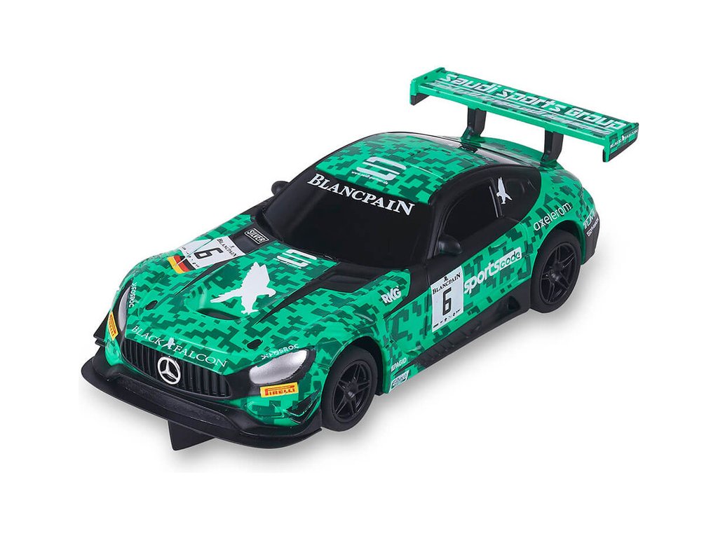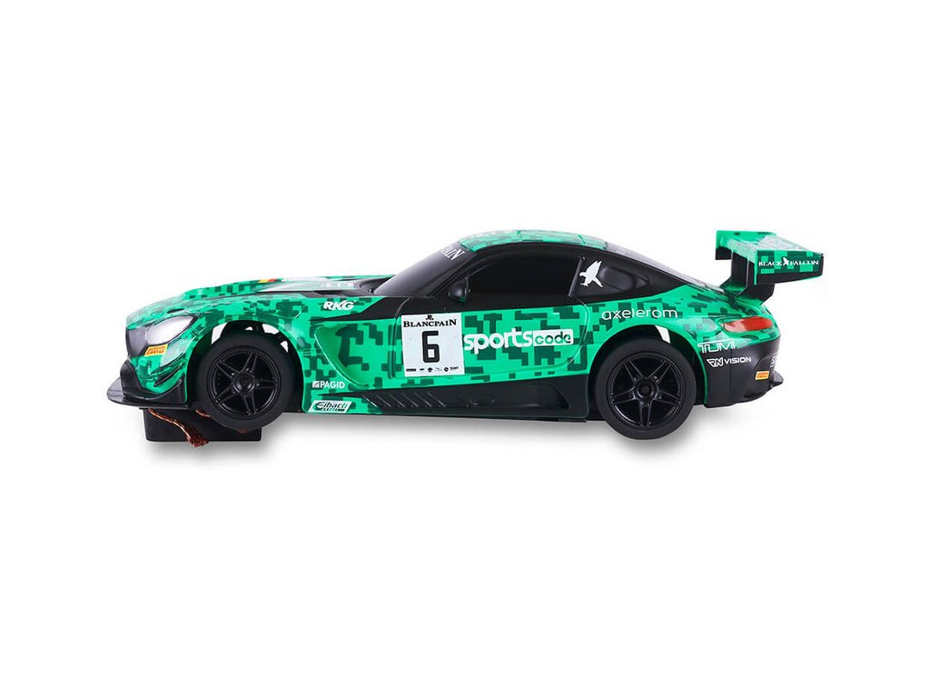 Dráhové autíčko SCX Compact Mercedes AMG GT 3 #6 Zelené v měřítku 1:43, pro autodráhy SCX Compact. Autíčko není vybaveno světly.