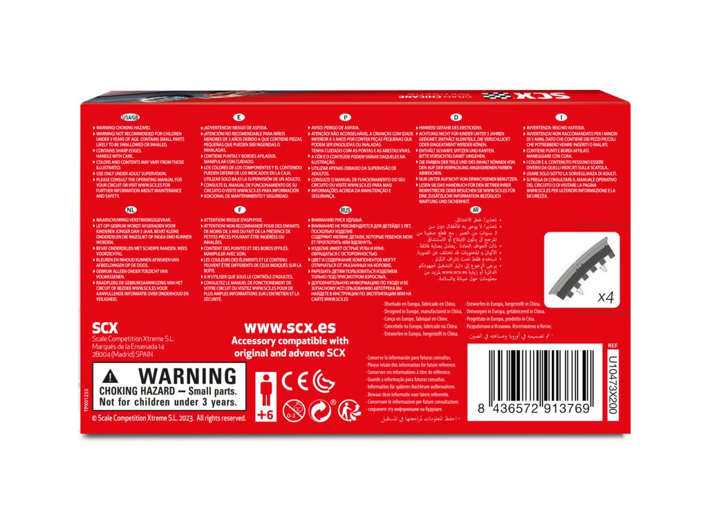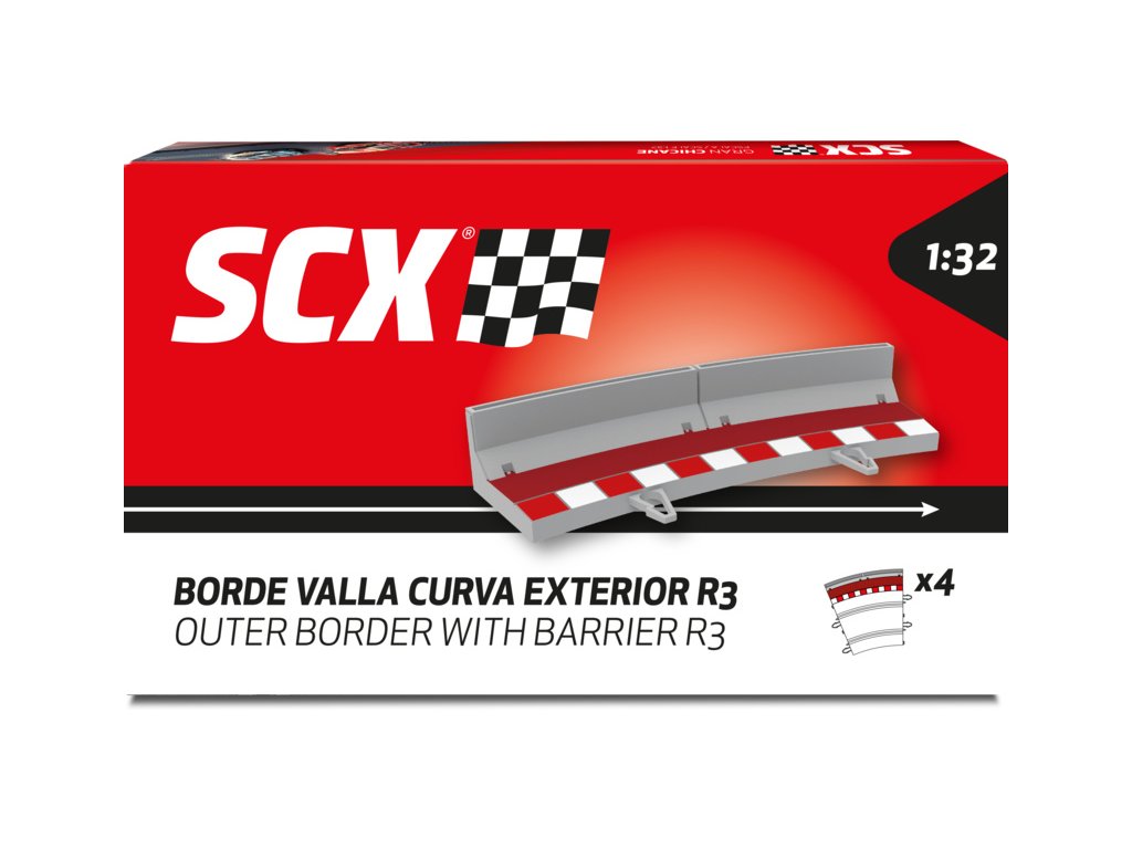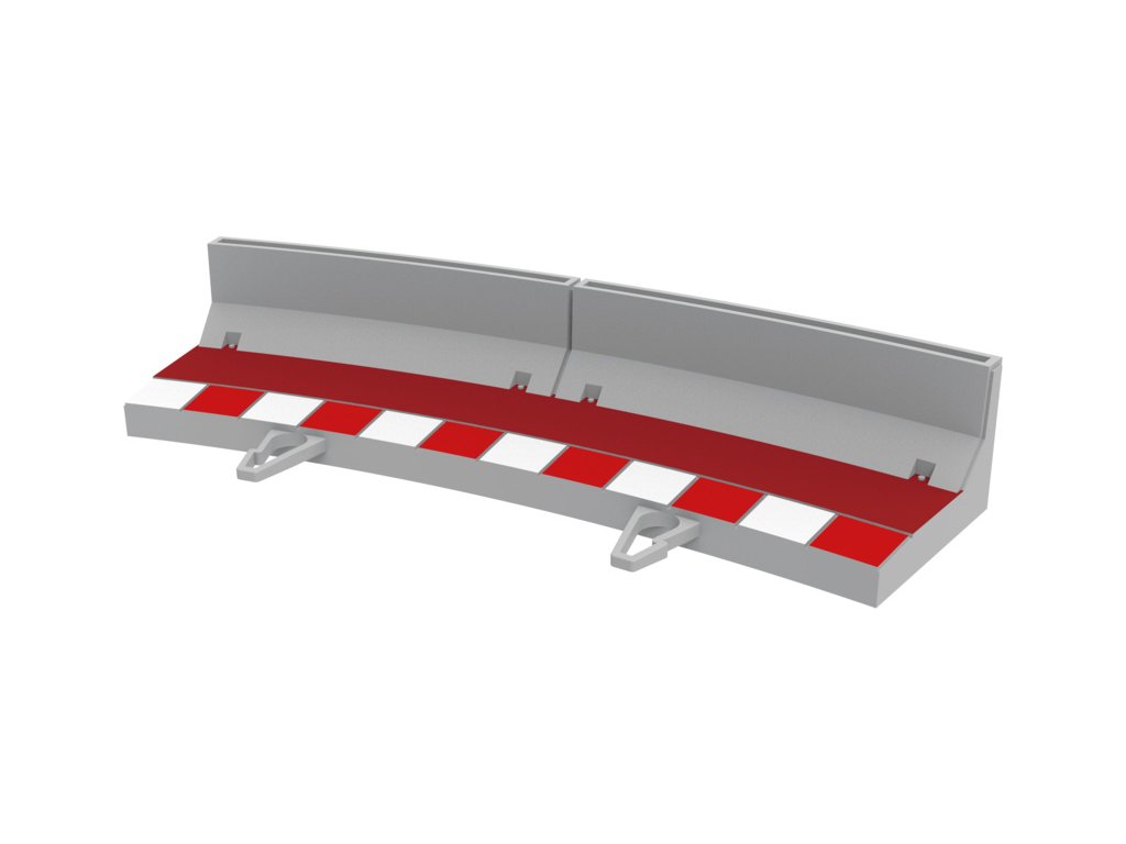 Krajince s mantinely pro vnější oblouk R3 autodráh SCX 1:32. Balení obsahuje 4 kusy krajnic s mantinely.