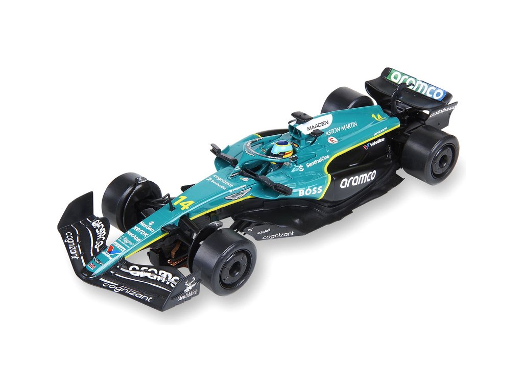 Dráhové autíčko SCX Original Aston Martin Formula 1 - Alonso 2025 v měřítku 1:32, pro analogové autodráhy SCX Original. Zatáčení předních kol.