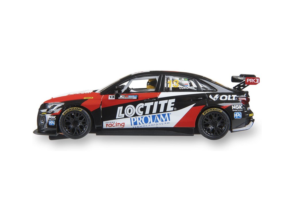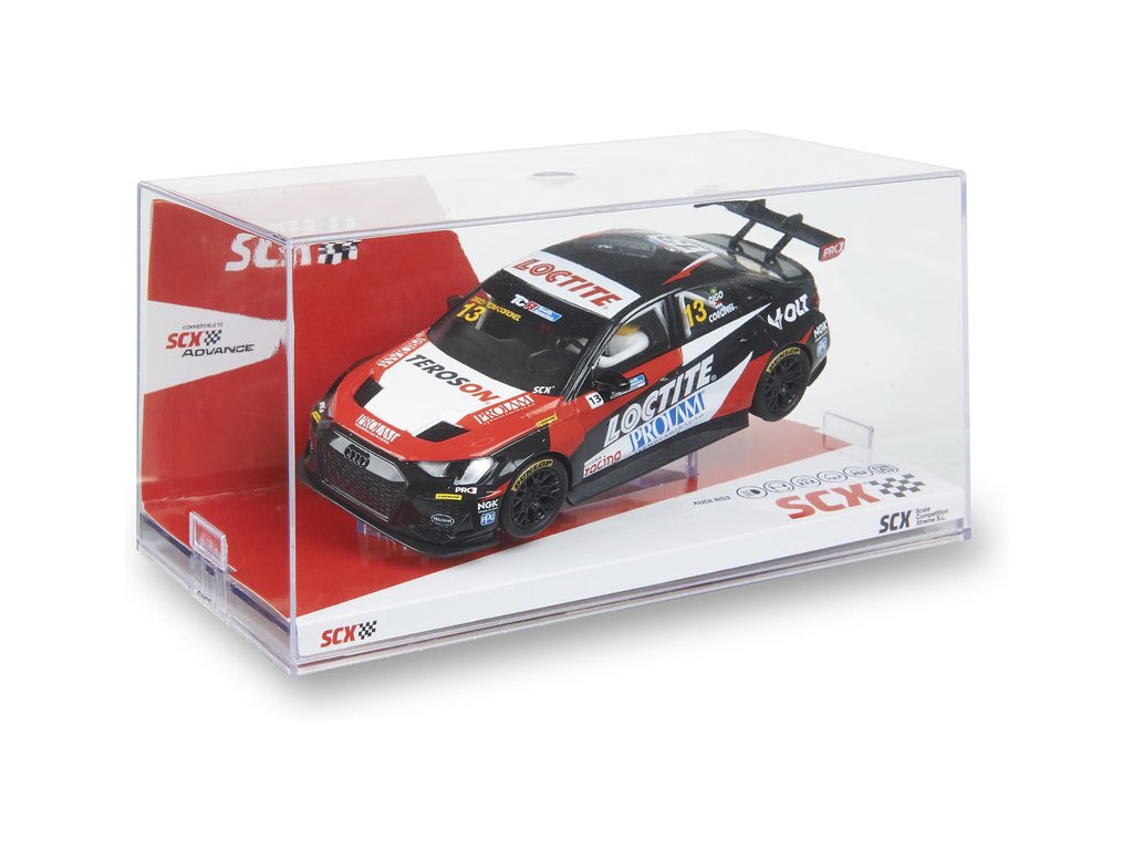 Dráhové autíčko SCX Original Audi RS3 LMS TCR Loctite v měřítku 1:32, s osvětlením, pro analogové autodráhy SCX Original. Pokud doplníte SCX Advance Konverzní sada typ A - dlouhý SCXE10405X200, můžete auto použít pro autodráhu Advance.