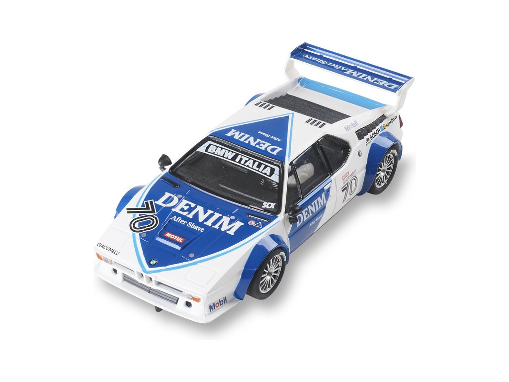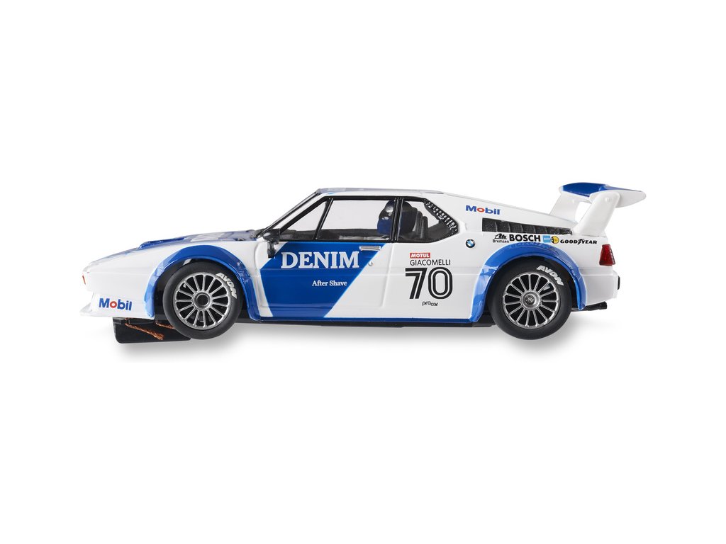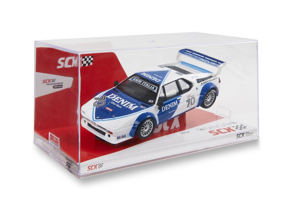 Dráhové autíčko SCX Original BMW M1 Denim v měřítku 1:32, s osvětlením, pro analogové autodráhy SCX Original. Pokud doplníte SCX Advance Konverzní sada typ A - dlouhý SCXE10405X200, můžete auto použít pro autodráhu Advance.