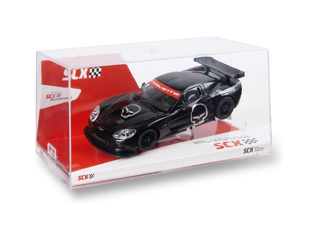 Dráhové autíčko SCX Original Corvette C6R Skull v měřítku 1:32, s osvětlením, pro analogové autodráhy SCX Original. Pokud doplníte SCX Advance Konverzní sada typ A - dlouhý SCXE10405X200, můžete auto použít pro autodráhu Advance.