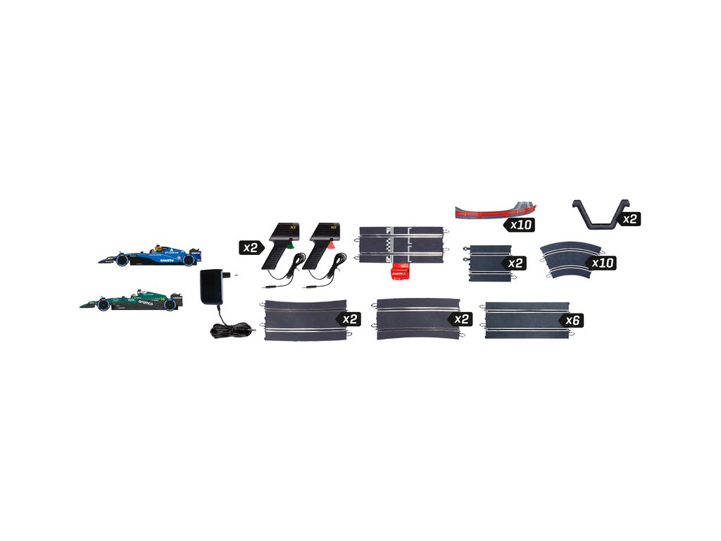 Balení obsahuje traťové díly, most, svodidla, 2x konverzní traťový díl, 2x dráhové autíčko, 2x ovladač a napájecí zdroj.
