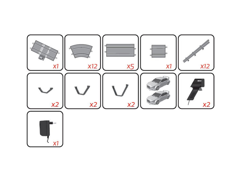 Balení obsahuje traťové díly, most, svodidla, 2x dráhové autíčko, 2x ovladač a napájecí zdroj. Návod CZ a manuál EN, ES, FR, PT, DE, NL, IT, RU.