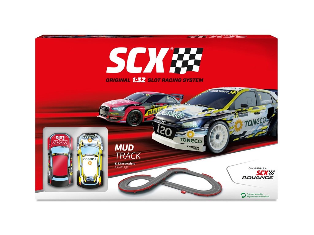 Autodráha SCX Original Mud Track v klasické měřítku 1:32 - analogová elektrická autodráha s rovinkami, zatáčkami, dlouhým mostem a ochrannými svodidly. Balení obsahuje dva ergonomické ovladače s citlivým ovládáním plynu, dvě detailně zpracovaná dráhová autíčka Audi S1 RX a Hyundai i-20 RX s výbornými jízdními vlastnostmi. Plocha pro rozložení: 184 x 148 cm. Délka tratě: 5,22 m. Složení tratě je velmi snadné, jednotlivé traťové díly zacvaknete do sebe, připojíte ovladače a můžete začít závodit.