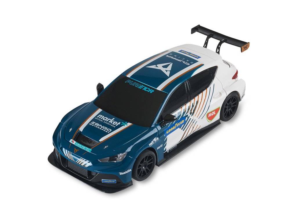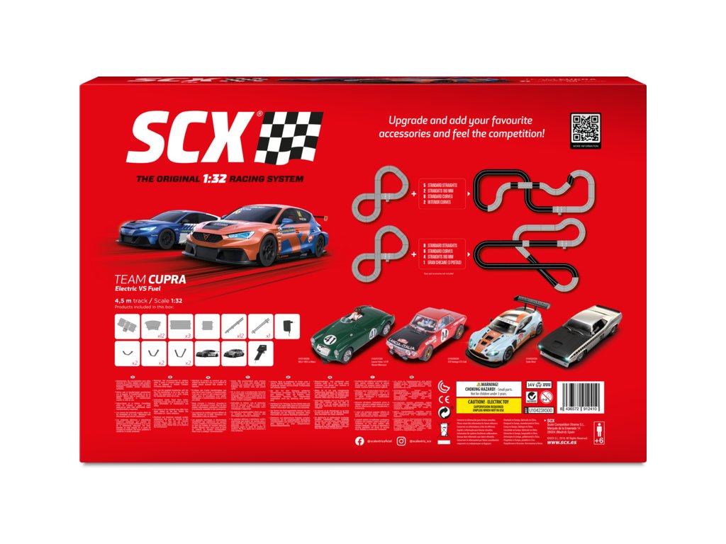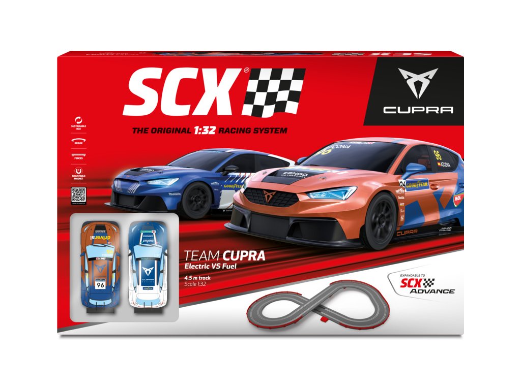 Elektrická autodráha SCX Original Team Cupra Electric vs Fuel v klasické měřítku 1:32 pro napínavější závody - analogová autodráha ve tvaru osmičky s ochrannými svodidly. Dva ergonomické ovladače, dvě detailně zpracovaná dráhová autíčka Team Cupra. Délka tratě: 4,50 m. Složení tratě je velmi snadné, jednotlivé traťové díly zacvaknete do sebe, připojíte ovladače a můžete začít závodit.