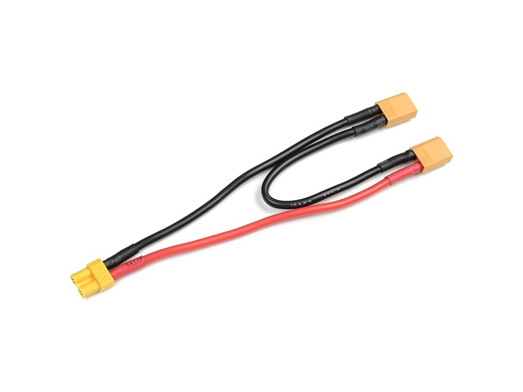 Sériový Y-kabel s konektory XT-30 a kabely 12AWG, délka 12cm. Dva přístrojové (pro baterie) a jeden bateriový konektor (do regulátoru). Do série se mohou zapojovat pouze akumulátory stejného typu, stejného napětí a stejné kapacity!