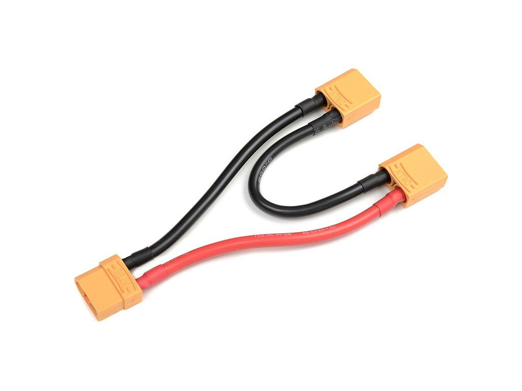 Sériový Y-kabel s konektory XT-90 Anti-Spark a kabely 10AWG, délka 12cm. Dva přístrojové (pro baterie) a jeden bateriový konektor (do regulátoru). Do série se mohou zapojovat pouze akumulátory stejného typu, stejného napětí a stejné kapacity!