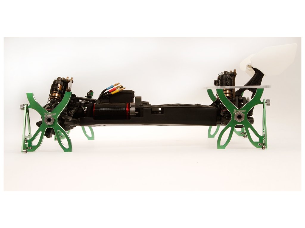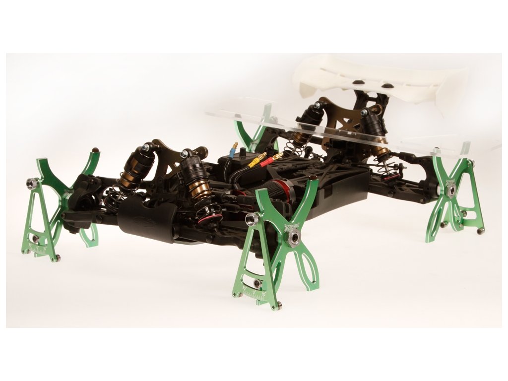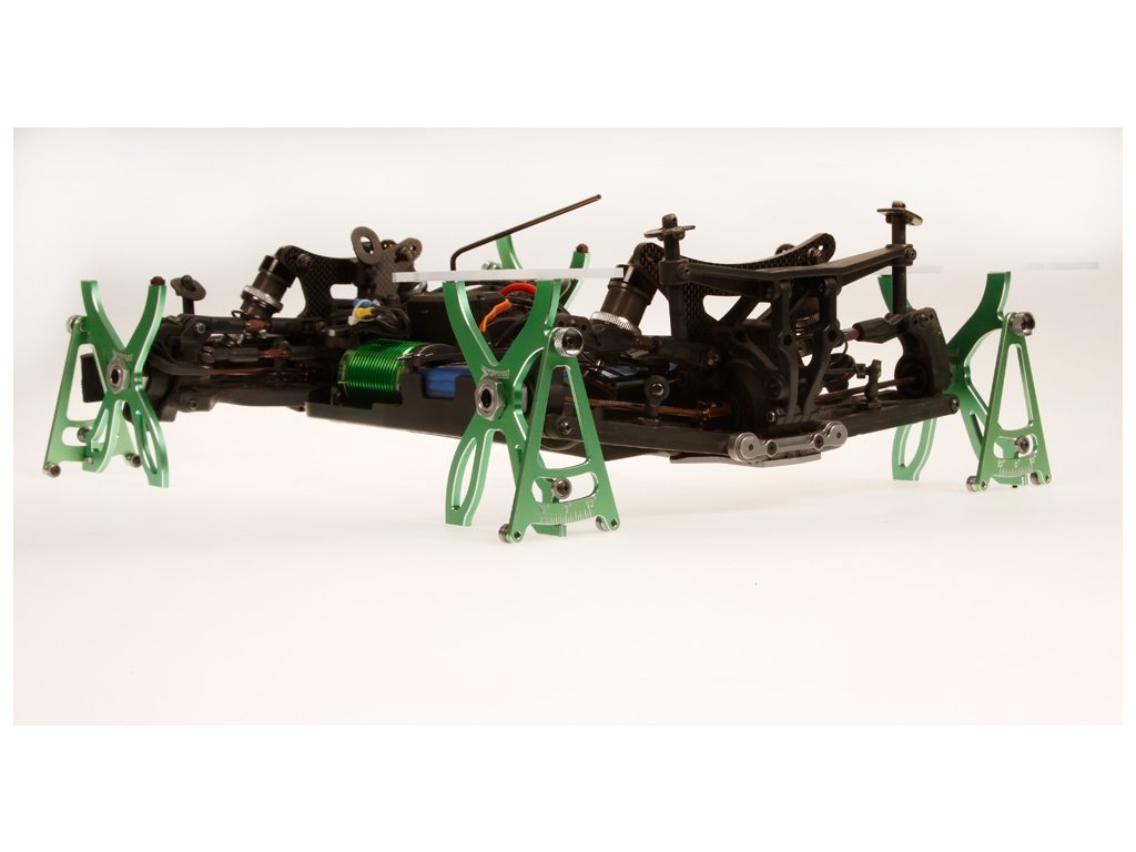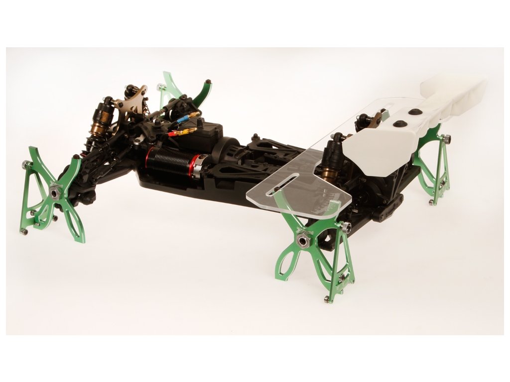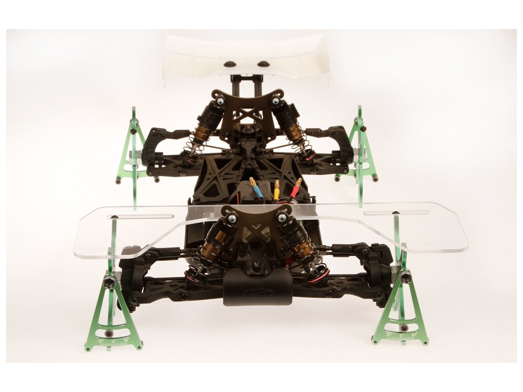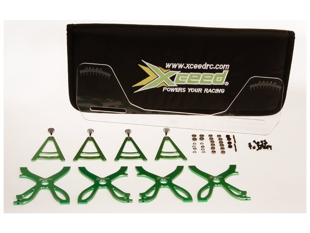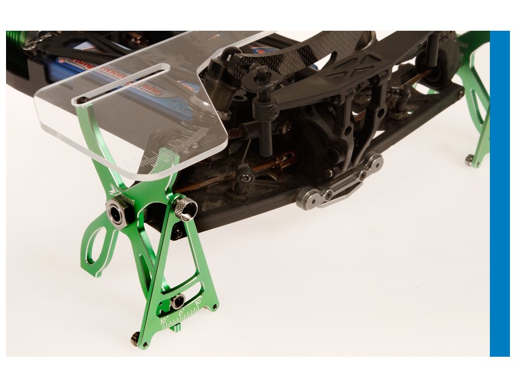 Systém nastavení pro RC aut v měřítku 1/8 Buggy, Truggy a GT (v obou verzích jak elektro tak i spalovák). Zahrnuje - Přesně opracované hliníkové držáky ve studené zelené eloxaci - Vroubkované matice pro snadnou a rychlou montáž kol - Vysoce kvalitní spojovací prvky - Obráběné nylonové výstředníky pro průměr pneumatiky - Plně uložené v kuličkových ložiskách - Přesné gravírování a značení - Polykarbonátová horní deska - Praktický úložný vak