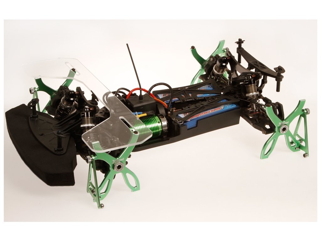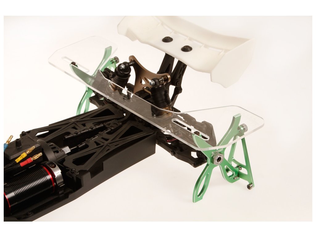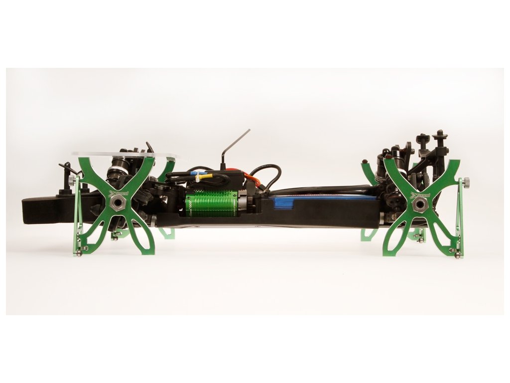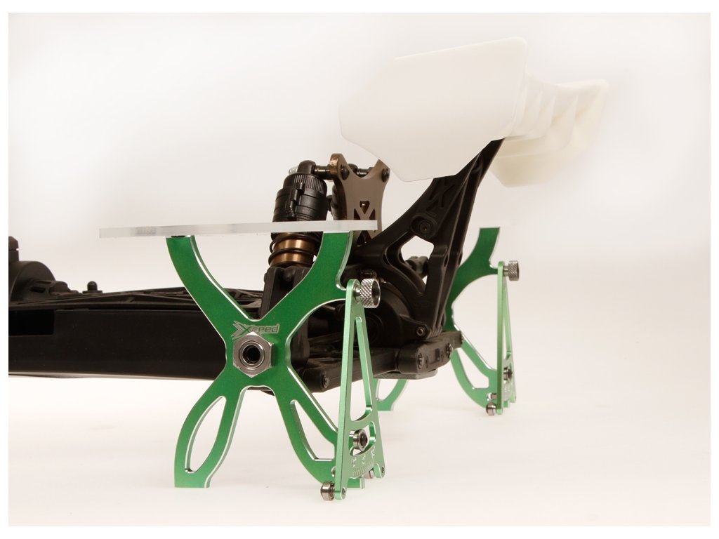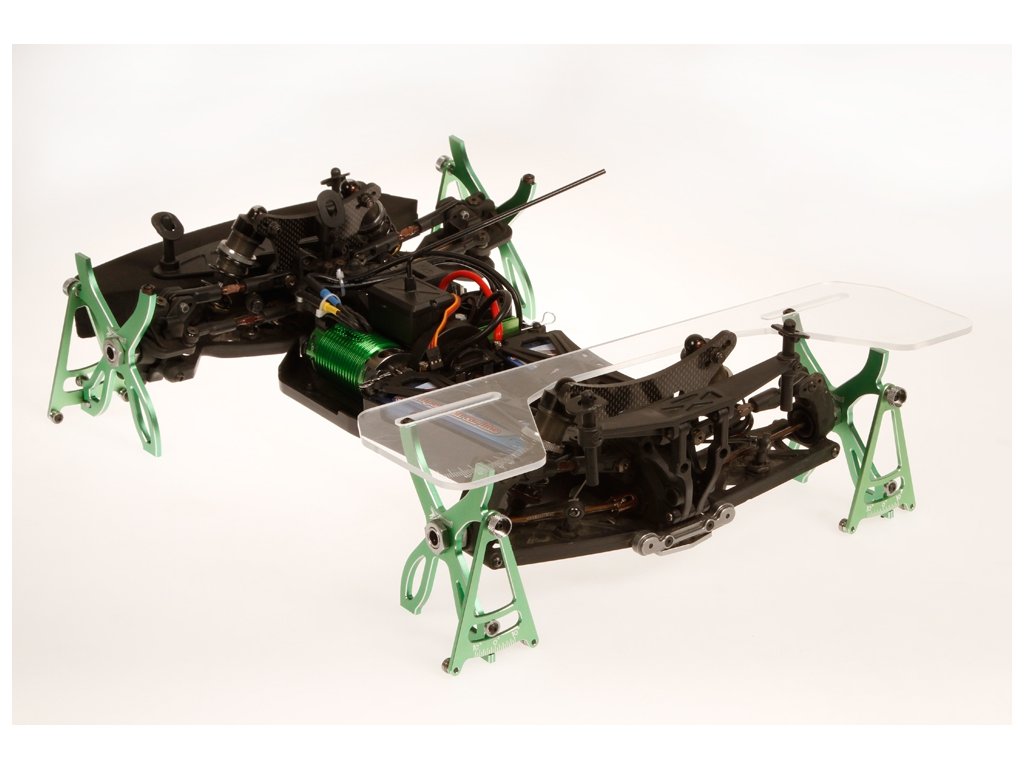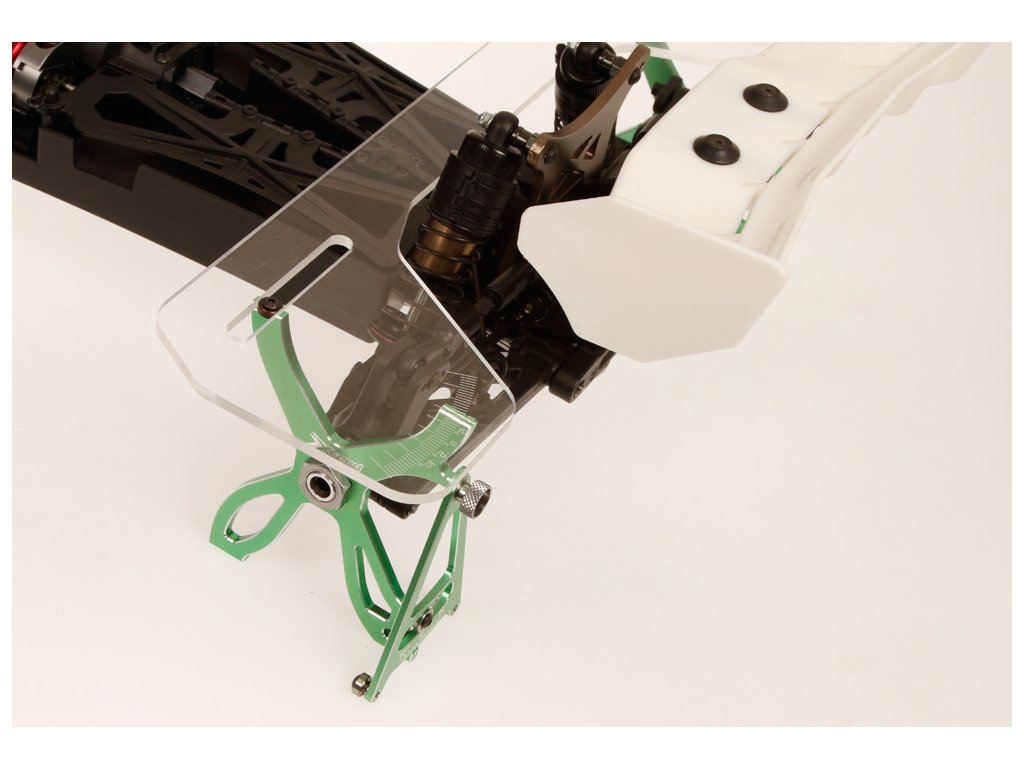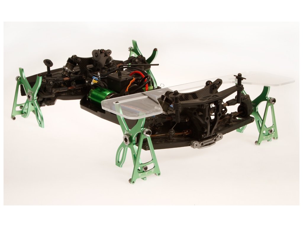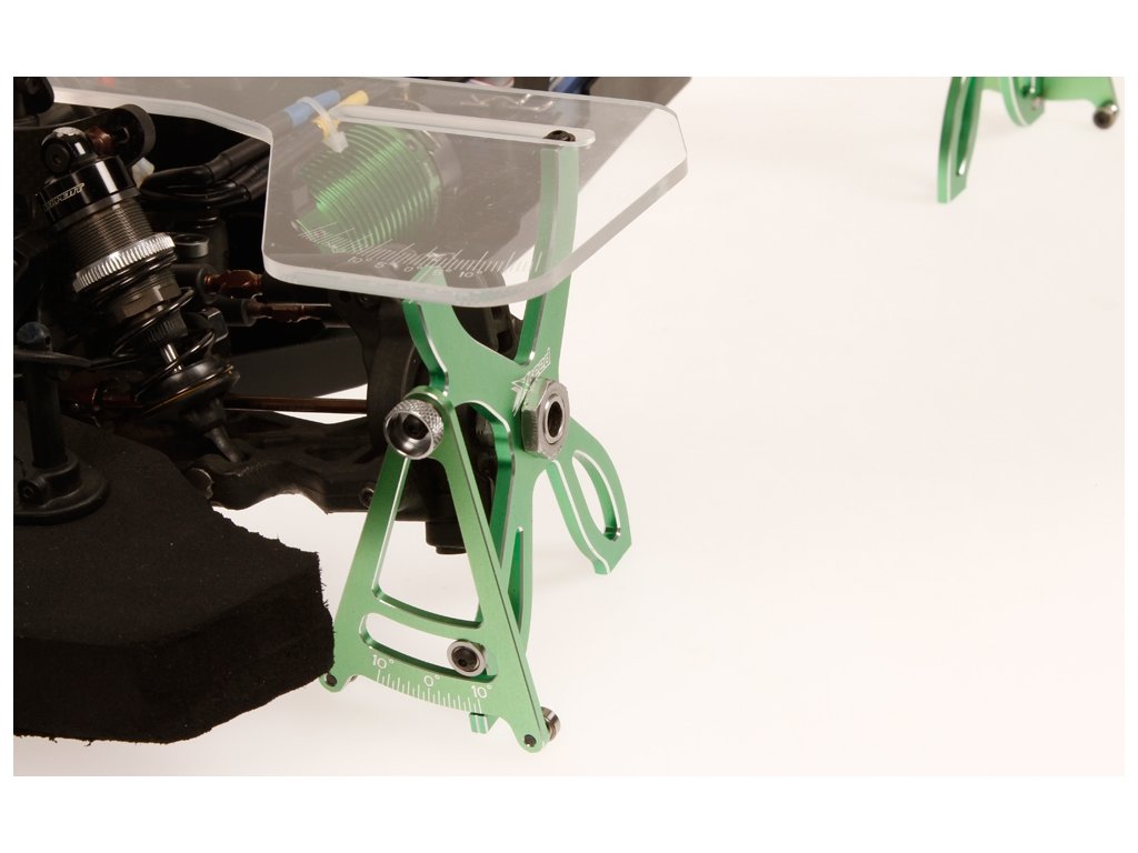 Systém nastavení pro RC aut v měřítku 1/8 Buggy, Truggy a GT (v obou verzích jak elektro tak i spalovák). Zahrnuje - Přesně opracované hliníkové držáky ve studené zelené eloxaci - Vroubkované matice pro snadnou a rychlou montáž kol - Vysoce kvalitní spojovací prvky - Obráběné nylonové výstředníky pro průměr pneumatiky - Plně uložené v kuličkových ložiskách - Přesné gravírování a značení - Polykarbonátová horní deska - Praktický úložný vak