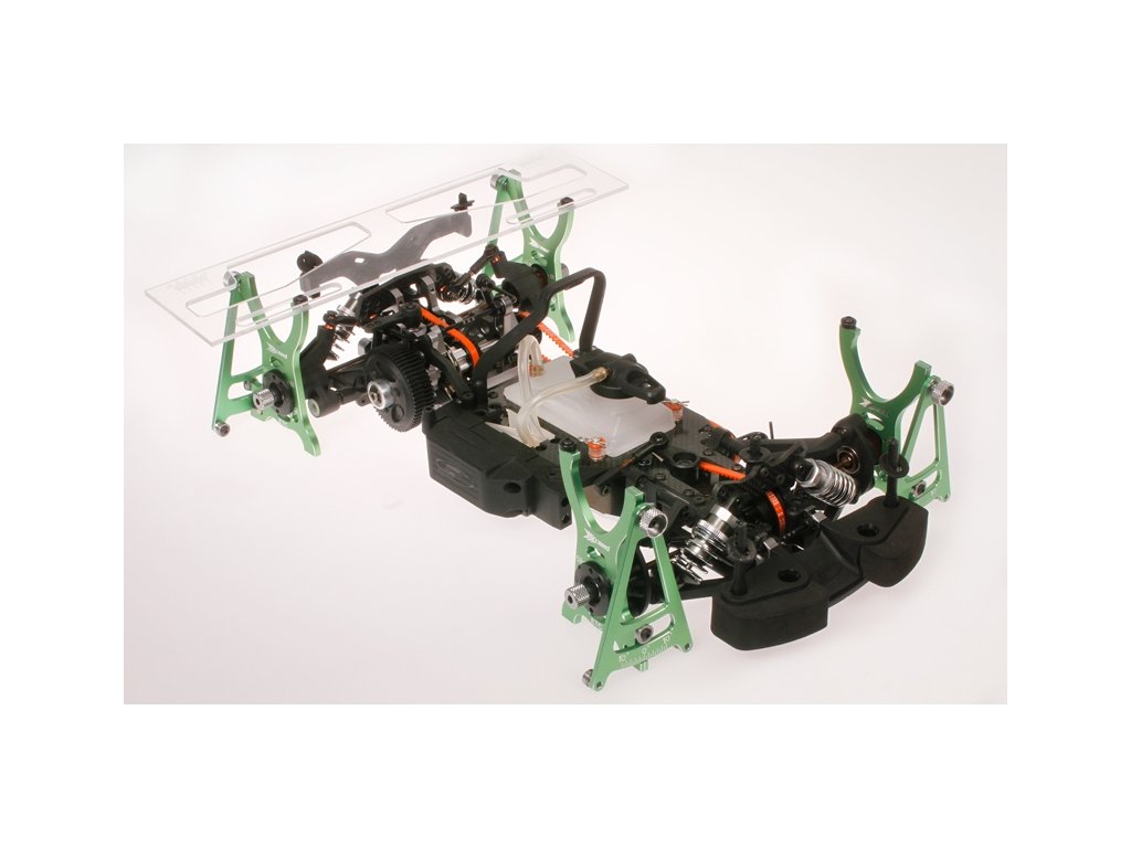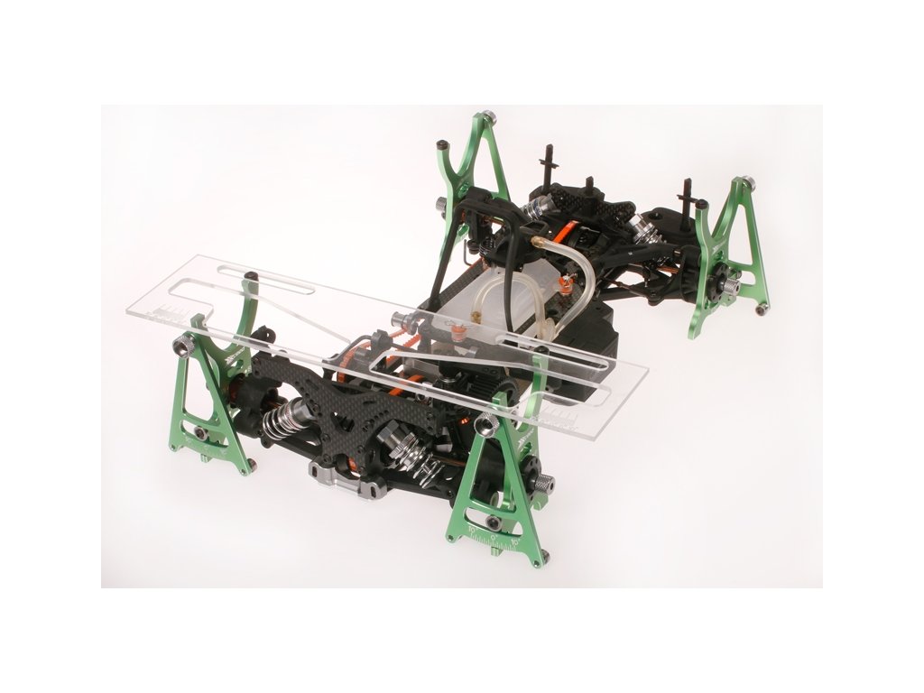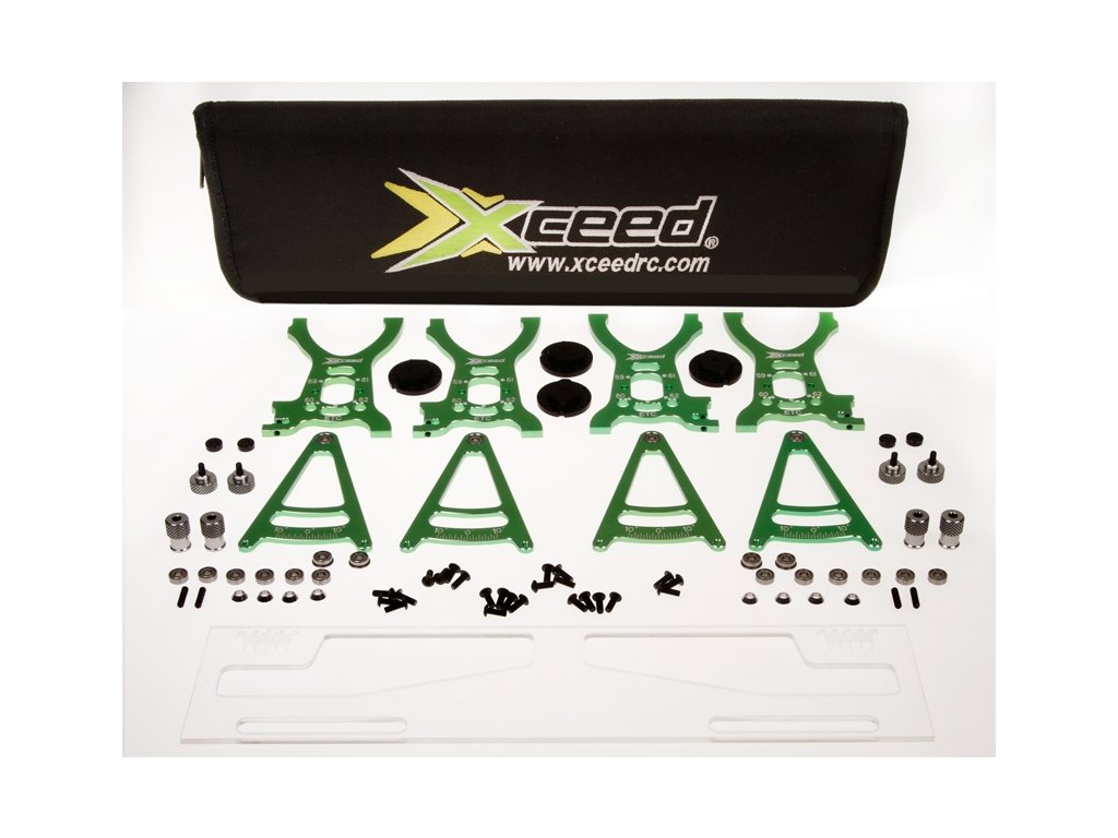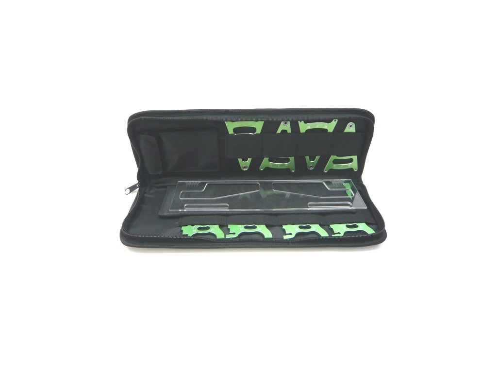 Systém nastavení pro RC aut v měřítku 1/10. Zahrnuje - Přesně opracované hliníkové držáky ve studené zelené eloxaci - Vroubkované matice pro snadnou a rychlou montáž kol - Vysoce kvalitní spojovací prvky - Obráběné nylonové výstředníky pro průměr pneumatiky - Plně uložené v kuličkových ložiskách - Přesné gravírování a značení - Polykarbonátová horní deska - Praktický úložný vak