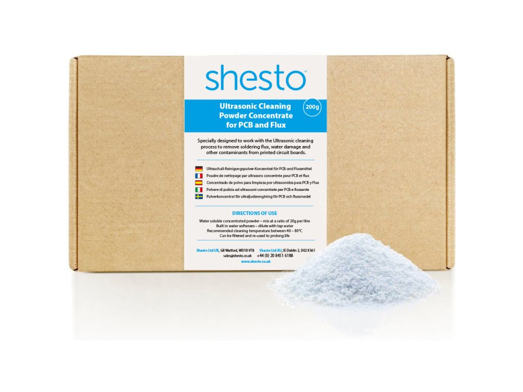 Speciálně navržený koncentrovaný prášek rozpustný ve vodě, pro ultrazvukové čištění k odstranění pájecího tavidla, oxidace a dalších nečistot z desek plošných spojů. Vytvoření až 10 l roztoku z 200 g koncentrátu. Pro prodloužení životnosti lze roztok filtrovat a znovu použít. Práškový koncentrát se oproti klasickým roztokům snáze skladuje.