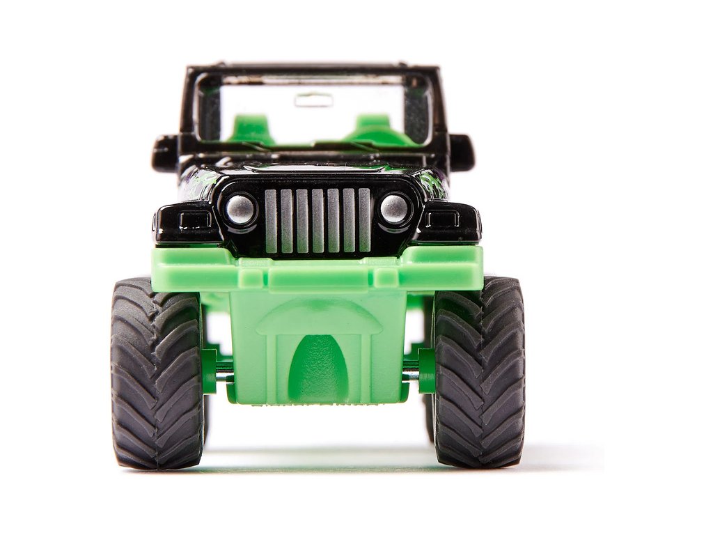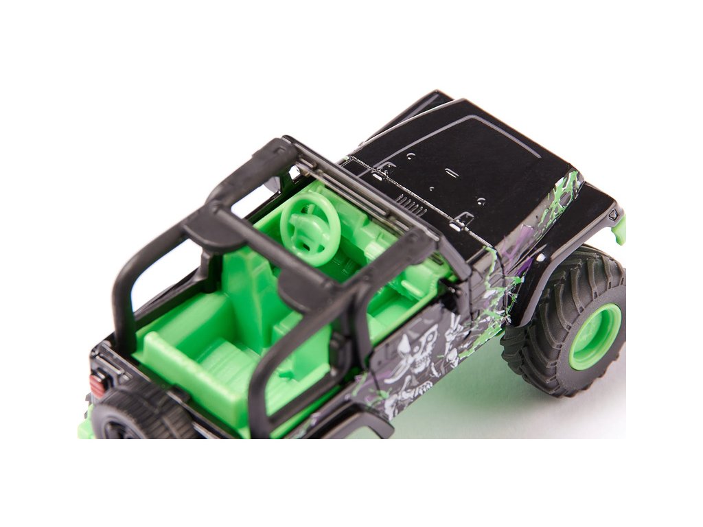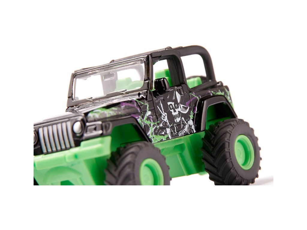 Kovový model terénního auta Jeep Big Wheel v měřítku 1:50 od značky Siku. Model má pogumované pneumatiky, zpracovaný interiér, ochranné rámy a maketu rezervního kola. Po stranách je úžasná grafika s kostlivcem. Charakteristický design, výrazná maska a terénní nárazníky dodávají modelu realistický vzhled a činí z něj skutečnou dominantu každé sbírky. Vhodné pro hraní i sběratelství. Kvalitní zpracování z kovu a plastu. Baleno v blistru.