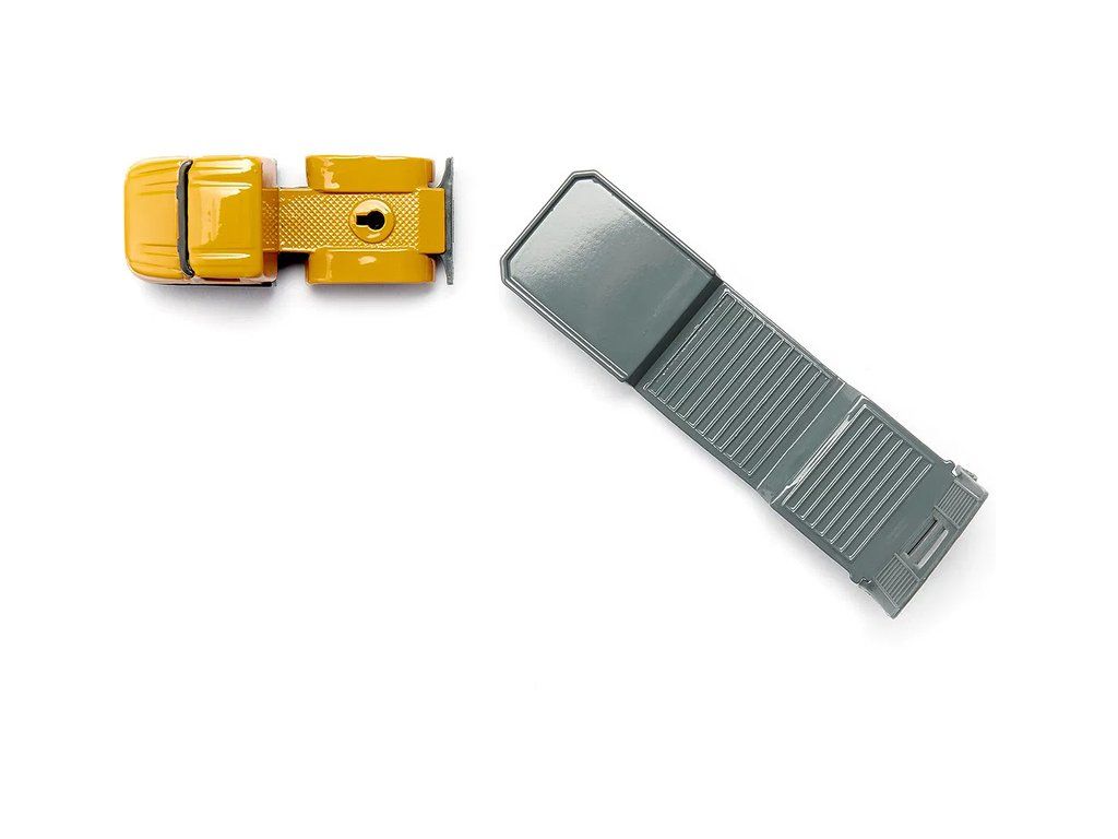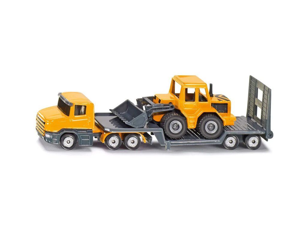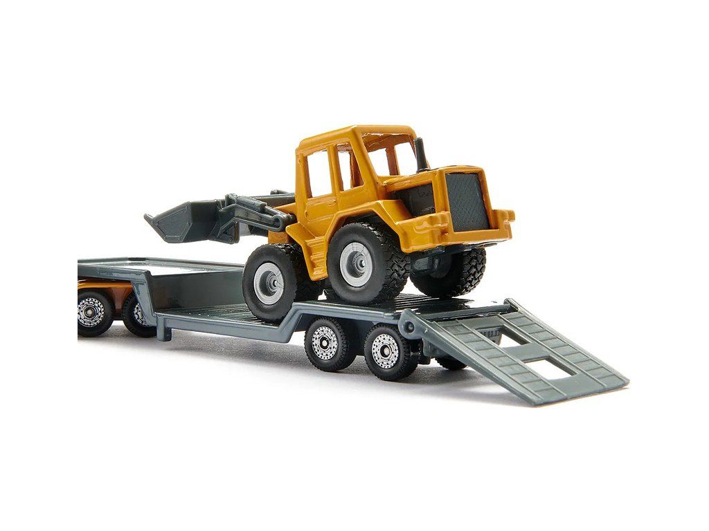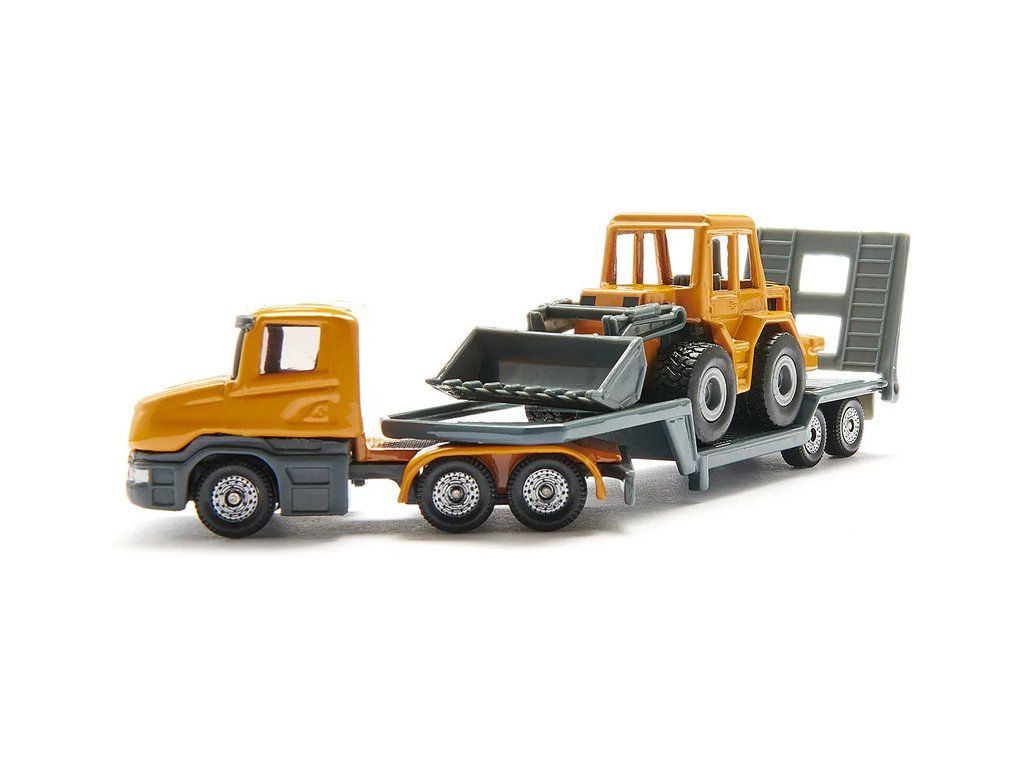 Kovový model tahače s podvalníkem a nakladačem, délka přibližně 16 cm. Návěs má sklopné nájezdy, rameno nakladače je pohyblivé, včetně nakládací lopaty. Vhodné pro hraní i sběratelství. Kvalitní zpracování z kovu a plastu. Baleno v blistru.