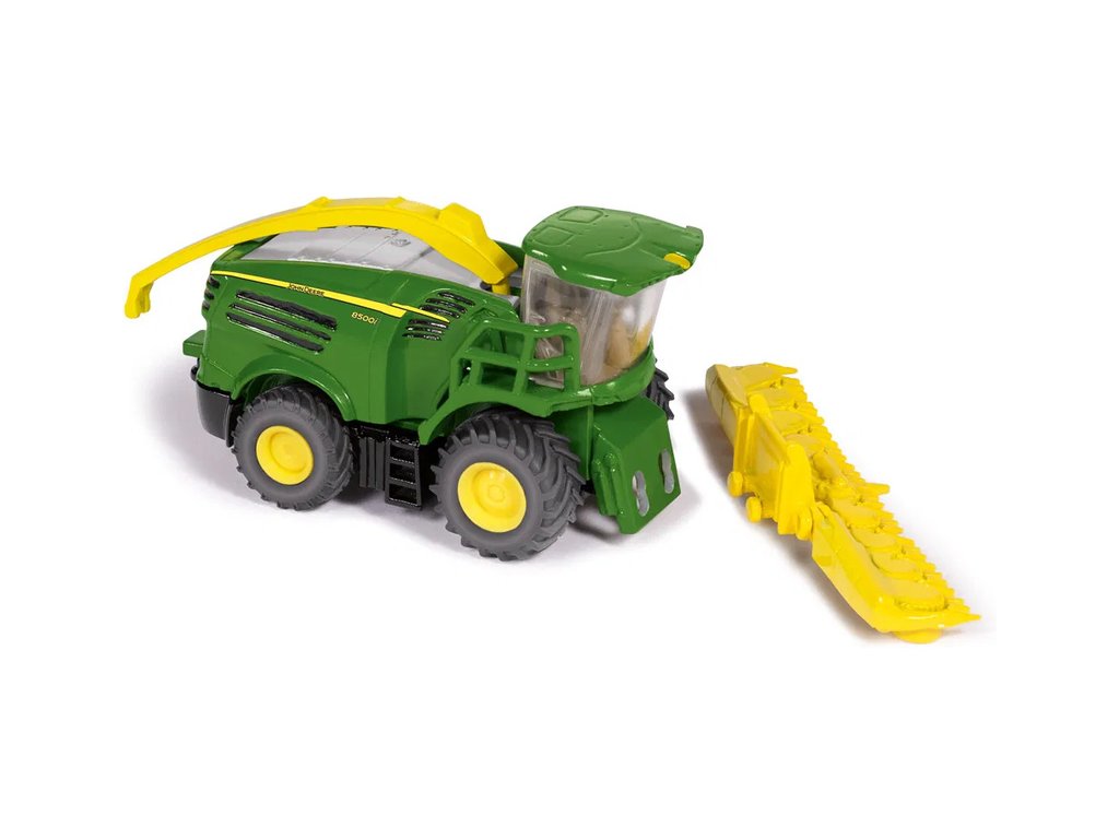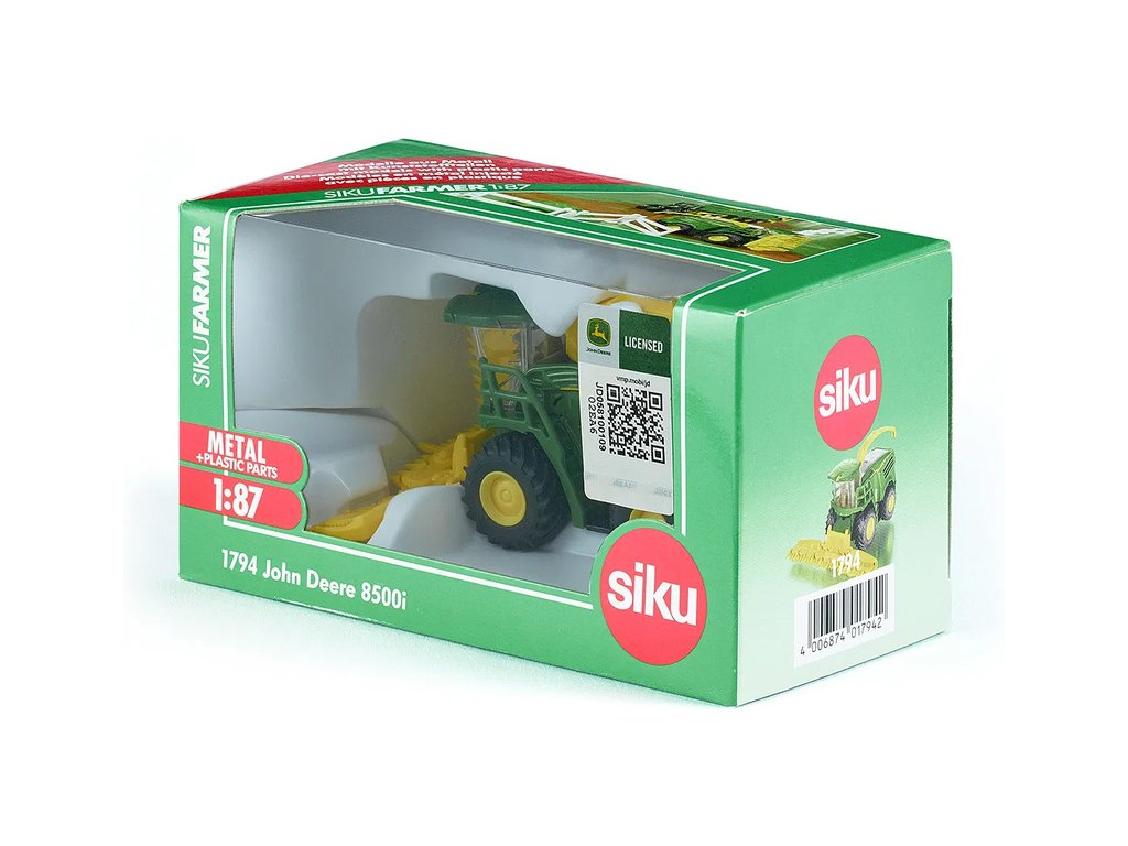 Kovový model žacího stroje John Deere 8500i v měřítku 1:87 od značky Siku. Model má pogumovaná kola, přední žací lištu na kukuřici lze vyjmout, vyprazdňovací rameno je otočné. Vhodné pro hraní i sběratelství. Kvalitní zpracování z kovu a plastu.