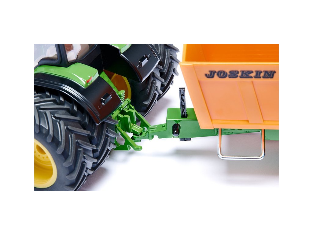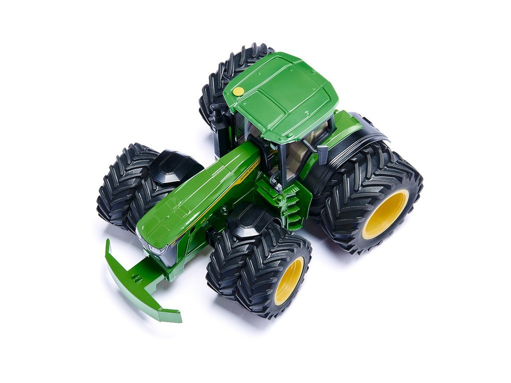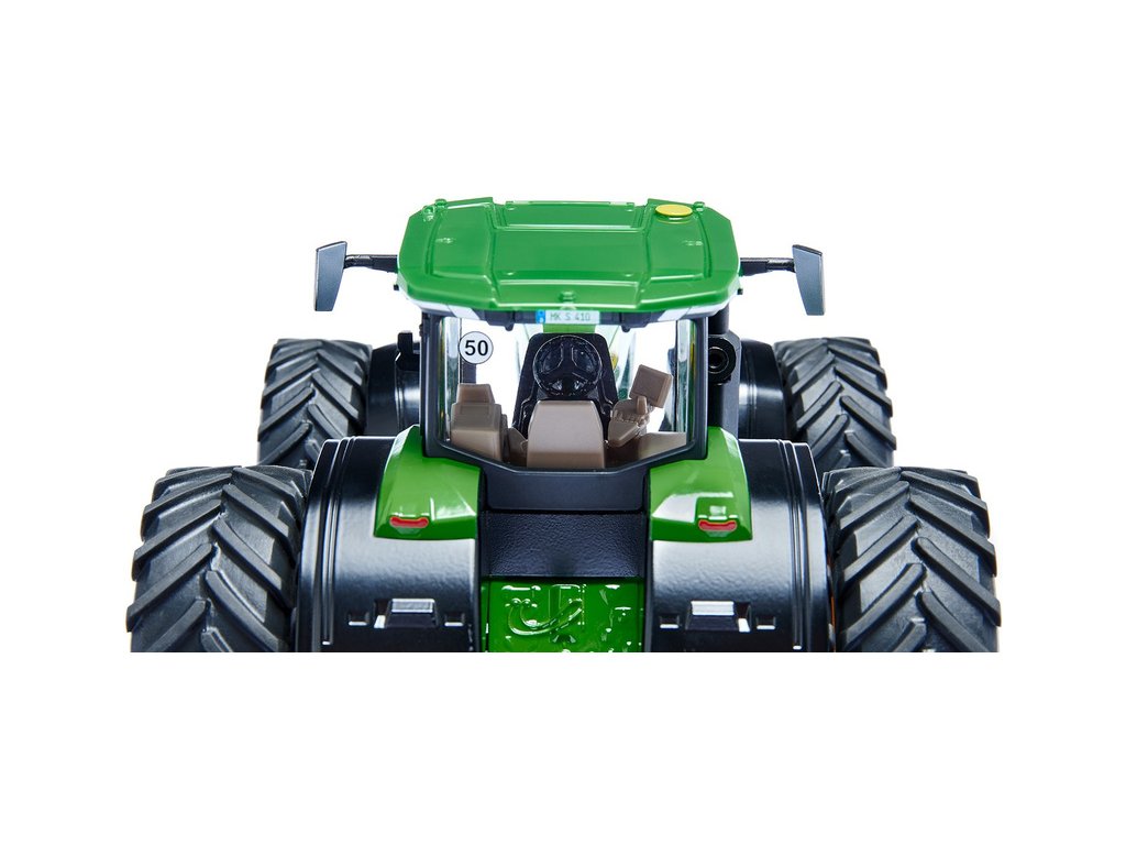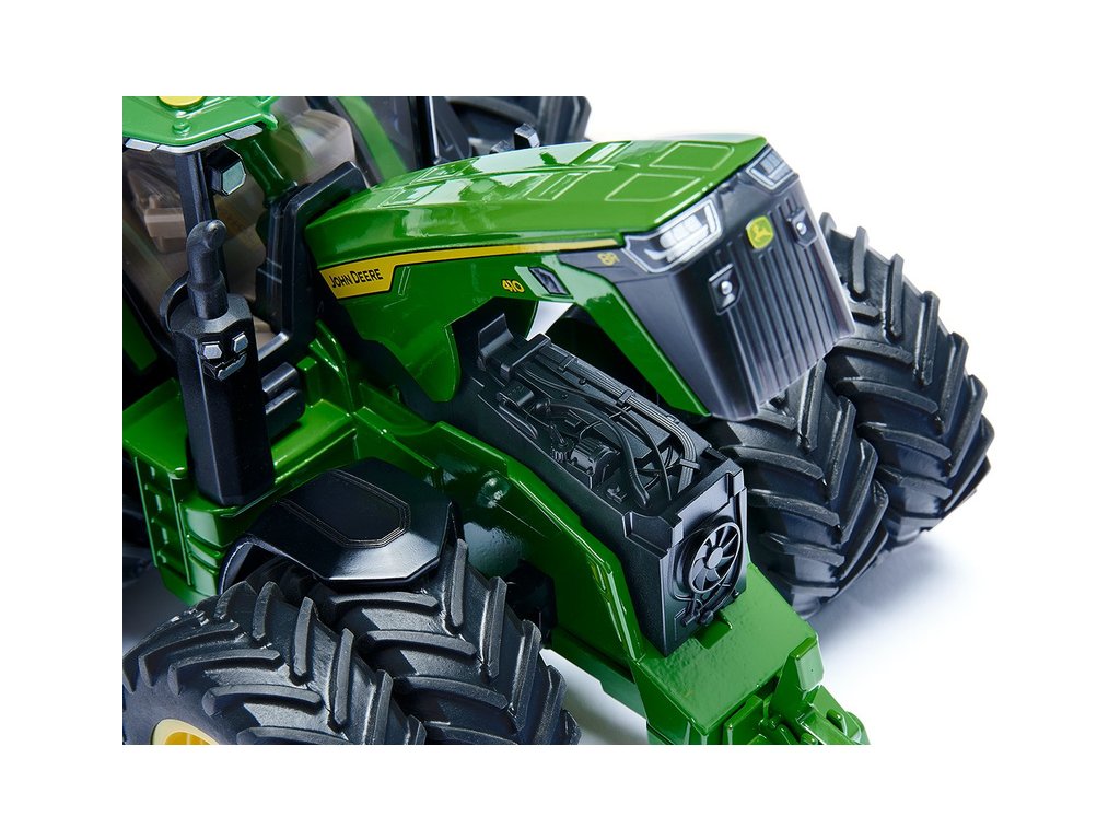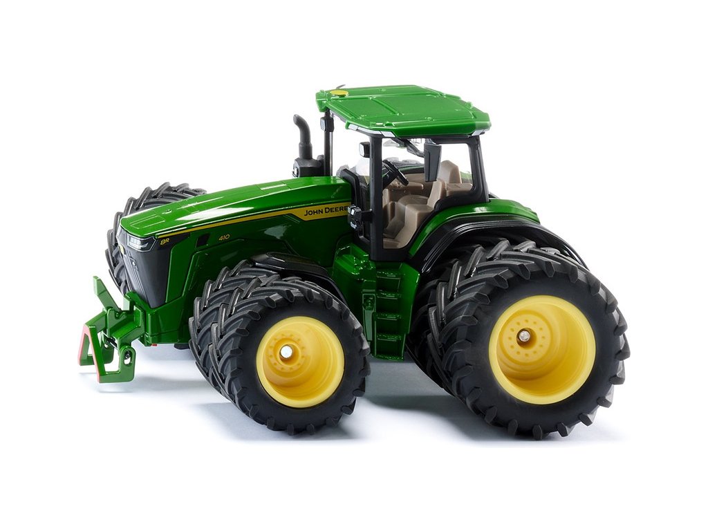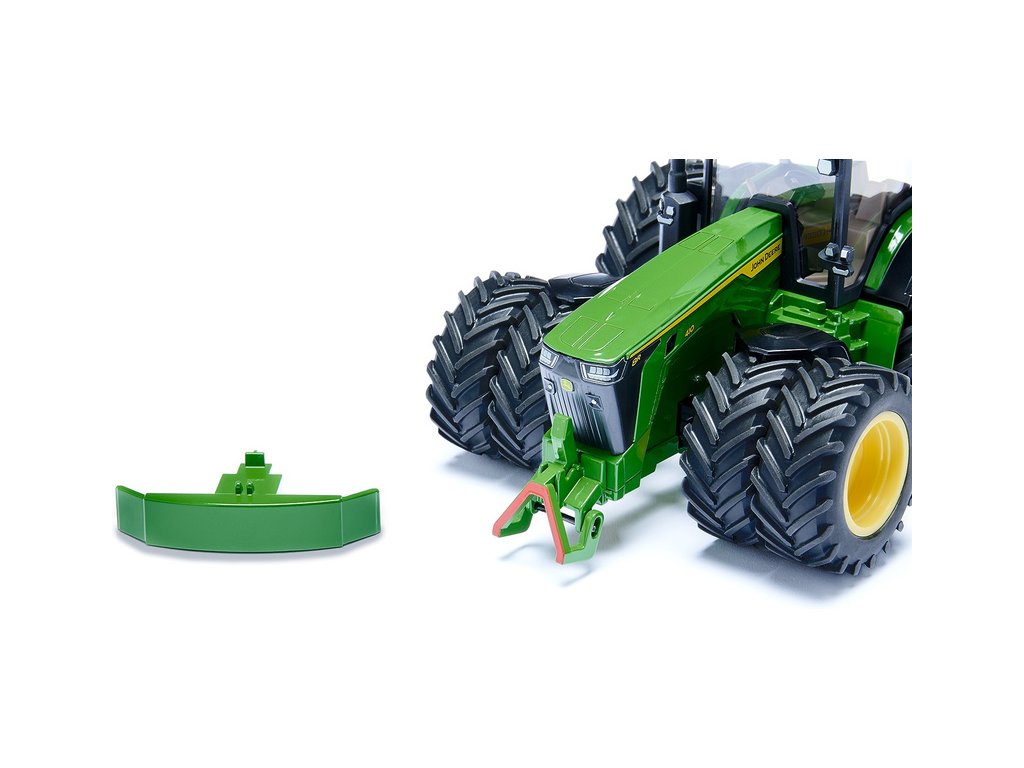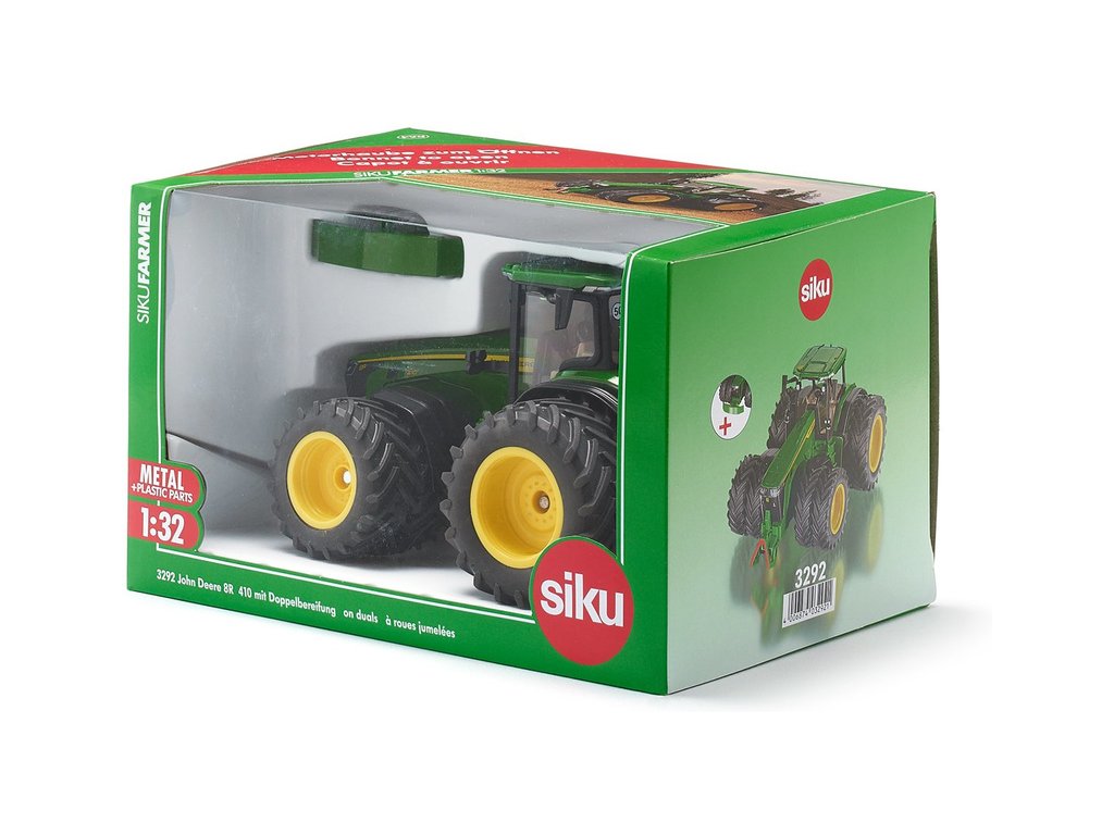 Kovový model traktoru John Deere 8R 410 v měřítku 1:32. Se zatáčením předních kol pomocí volantu, dvojitými gumovými koly, kyvadlovou přední nápravou a otevíracím krytem motoru. Kabinu se sklopnými zrcátky lze oddělat. Přední držák a zadní závěs umožňují použití dalšího příslušenství Siku 1:32. Součástí balení je maketa předního závaží, kterou lze nacvaknout místo předního držáku. Vhodné pro hraní i sběratelství. Kvalitní autentické zpracování z kovu a plastu.