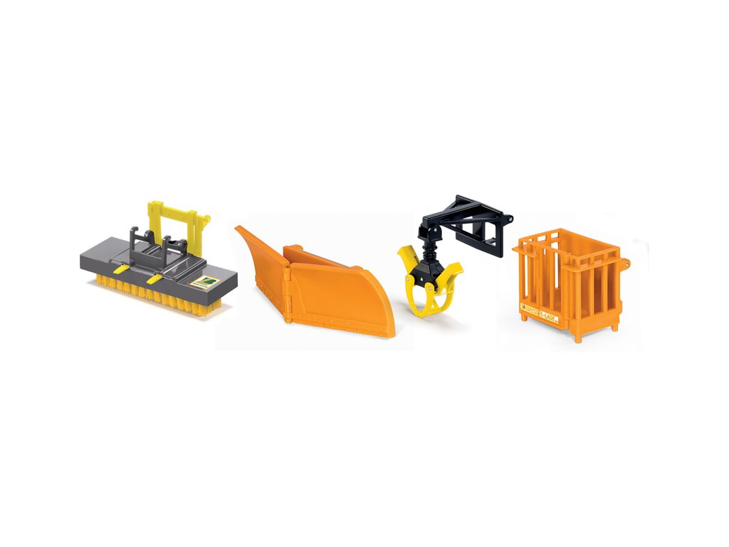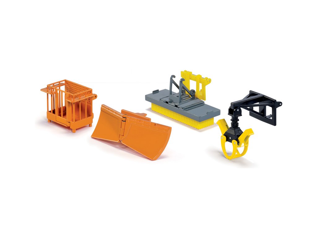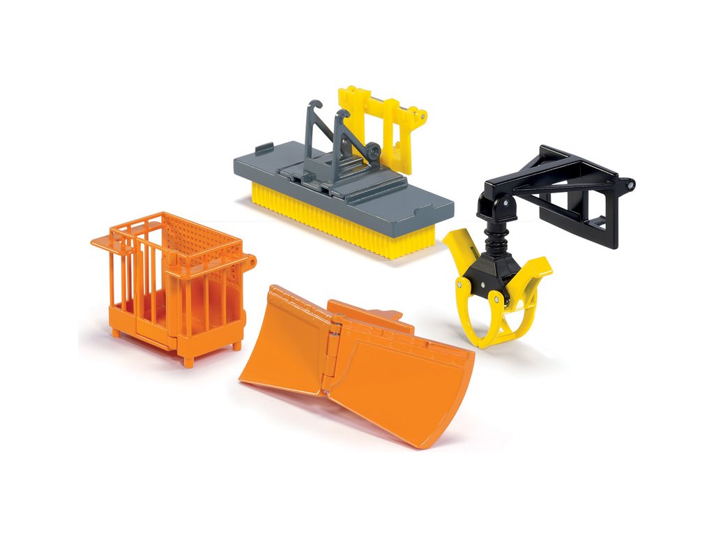 SIKU Farmer - příslušenství. Lze použít pro modely Siku v měřítku 1:32 s předním nakladačem. Obsahuje pracovní plošinu s otevíracími dvířky, nastavitelný sněžný pluh s maketami pístu, kartáč s paletovacími vidlemi a mechanickou ruku pro uchopení kmenů.