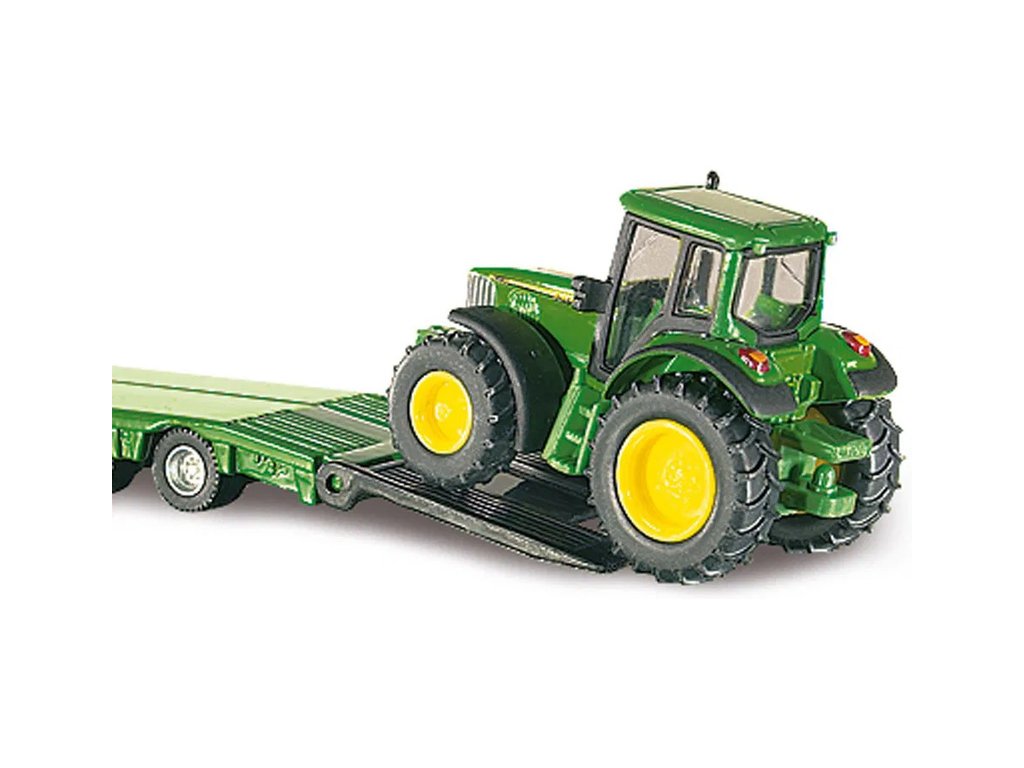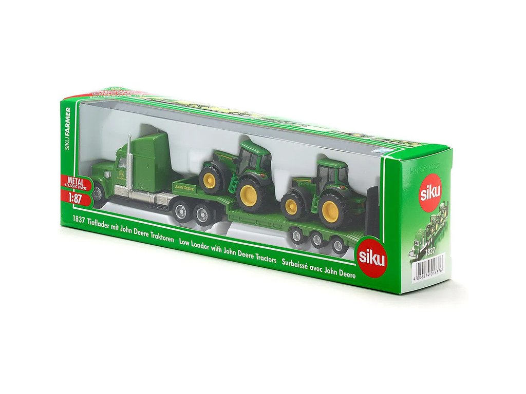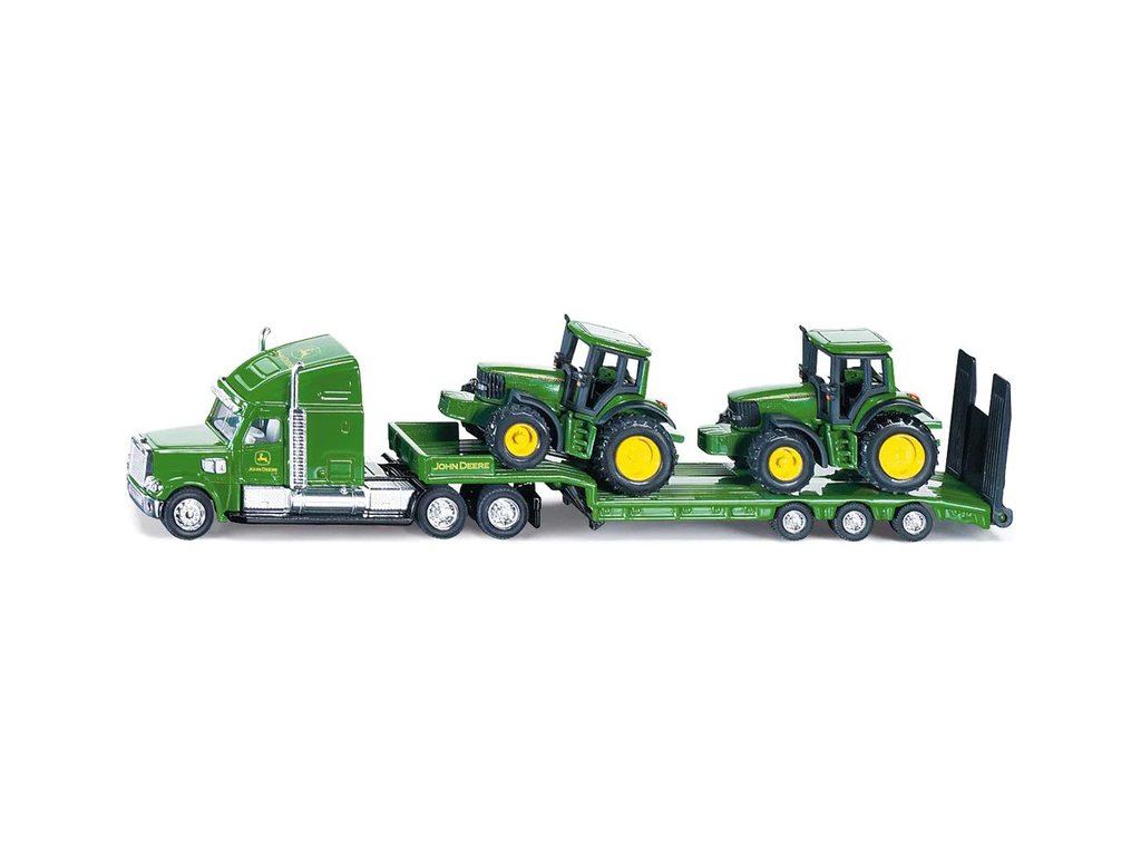 Kovový model tahače s návěsem a dvěma traktory značky John Deere v měřítku 1:87 od značky Siku. Model obsahuje sklopné nájezdy na podvalník. Gumové pneumatiky. Krásný lak s chromovými prvky. Vhodné pro hraní i sběratelství. Kvalitní zpracování z kovu a plastu.