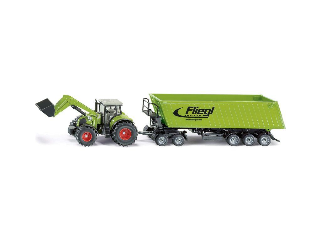 Kovový model traktoru Claas Axion 850 s předním nakladačem a přívěsem v měřítku 1:50. Model má pohyblivé přední rameno se lžící a oddělávací kabinu. Odpojitelný přívěs obsahuje vlastní výklopnou nohu pro stání a vyklápěcí korbu s otevíracím čelem. Vhodné pro hraní i sběratelství. Kvalitní zpracování z kovu a plastu. Přívěs lze kombinovat s jakýmkoliv traktorem SIKU v měřítku 1:50 a lze jej použít v řetězci sklizně k vyložení kombajnu.